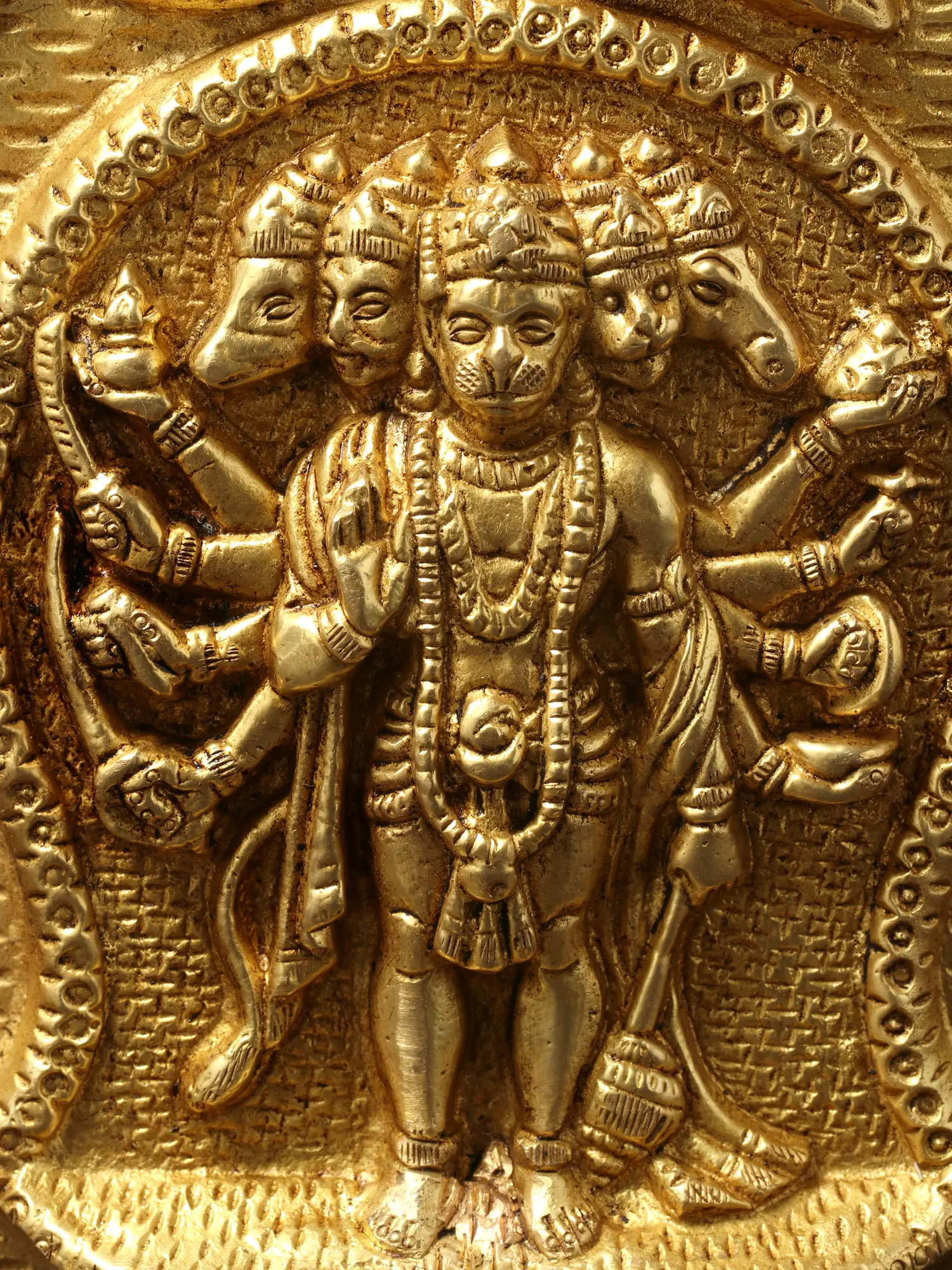 In this mesmerising wall hanging frame, Lord Panchamukhi Hanuman, the Gallant One, stands, a divine sentinel of power and grace. Five radiant faces adorn his majestic form, each facing a cardinal direction, symbolising his omnipresence. Clad in regal attire, Hanuman, “the devotee of Lord Rama”, wields symbols like a mighty “Sword”, a dazzling “Discus”, and an invincible Mace etc. Yet, his right hand is poised in the “Abhaya Mudra”, a reassuring gesture of protection and fearlessness. This artwork, carved in brass, signifies the multifaceted nature of the supreme Hanuman, the guardian of devotees. It beckons us to embrace courage, wisdom, and unwavering faith, knowing that the benevolent deity stands watch over our journeys.