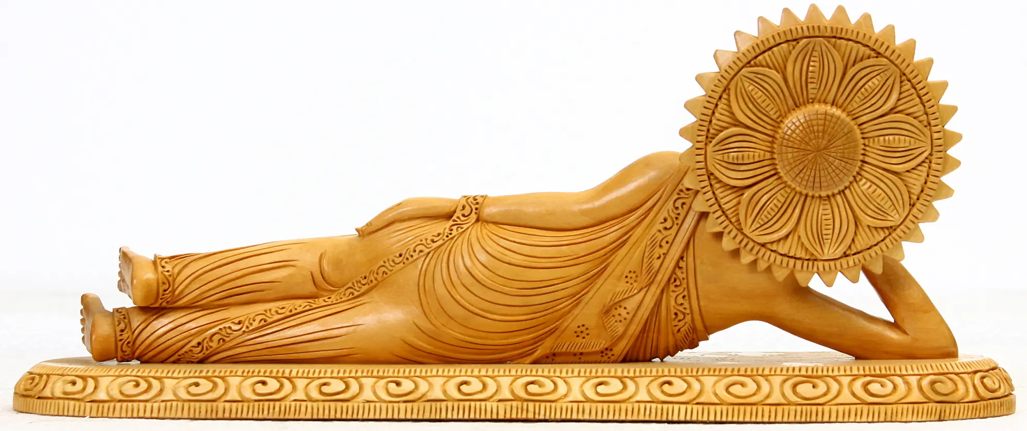 This handcrafted sculpture captures the serene moment of the Buddha's *parinirvana* – his passing into final nirvana, freeing himself completely from the cycle of rebirth and suffering. It depicts him reclining on his right side, his head gently resting on his hand. The Buddha's peaceful expression conveys a sense of profound tranquility and liberation, reflecting the ultimate goal of Buddhist practice. This is not a depiction of death as an end, but rather as a transition to eternal peace and wisdom.
