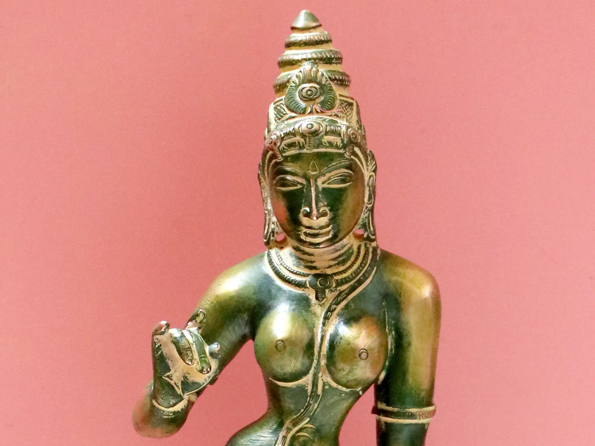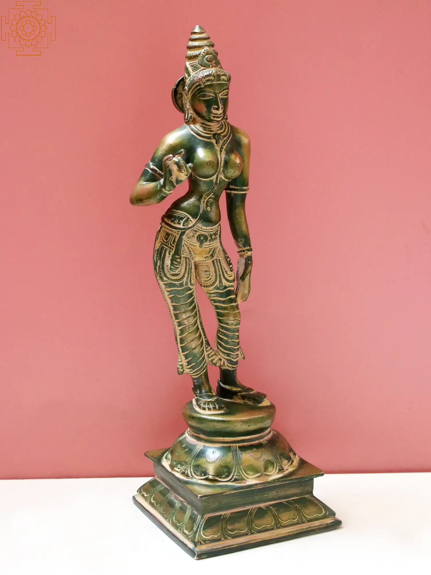 The craftsmanship of this brass sculpture is truly remarkable. The delicate rendering of her facial features, her serene gaze, and the subtle curves of her body suggest a divine being of immense compassion and power. The traditional motifs and patterns etched into her garments evoke ancient Indian textile traditions and spiritual symbolism. From her ornate headdress to the subtle movement of her draped lower garment, every element has been carefully sculpted to honor her divine presence. In Hindu mythology, Parvati is a central figure, a devoted wife and a fierce protector. She is the mother of Lord Ganesha, the remover of obstacles, and Lord Kartikeya, the god of war. Stories abound of her immense penance and unwavering devotion to Shiva, ultimately winning his heart and becoming his equal partner. Her transformations into powerful forms like Durga and Kali underscore her role as the ultimate protector of the cosmos against evil forces. This statue serves as a powerful reminder of her benevolent and protective nature, a beacon of hope and strength for devotees.