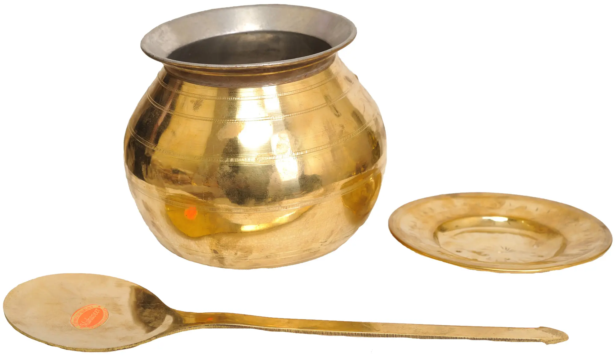 This exquisite brass vessel is more than just a cooking utensil; it is a conduit for devotion, a symbol of abundance, and a traditional instrument for preparing sacred offerings. Crafted from pure brass, a metal revered for its purity and its auspicious association with deities, this patra is designed to enhance the sanctity of your culinary rituals. Its generous form and the accompanying ladle make it ideal for preparing and serving *prasadam*, the blessed food offered to the divine and then distributed among devotees. The tradition of offering food, or *bhog*, to deities is deeply rooted in Hinduism. From the simple grains offered to Lord Ganesha to the elaborate feasts prepared for Goddess Lakshmi, food is seen as a way to nourish and please the gods, receiving their blessings in return. This patra, with its timeless design, connects you to this ancient practice, allowing you to create offerings that are both visually appealing and spiritually resonant. The lustrous brass, known for its ability to retain heat and its inherent purity, ensures that your preparations are made in a manner befitting the divine.