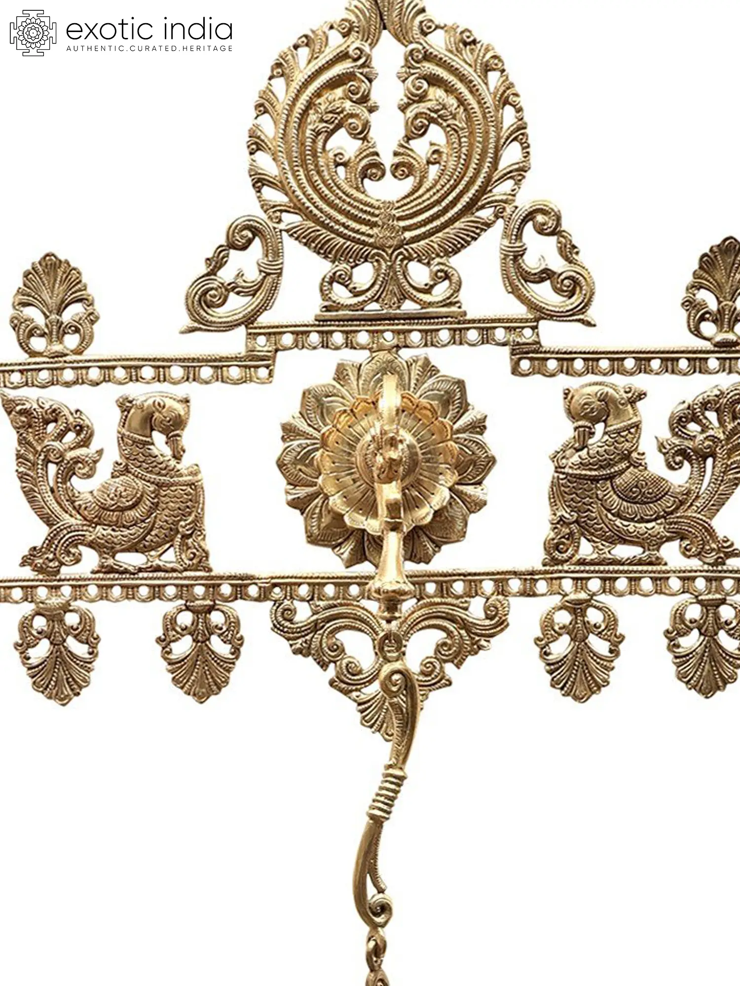 Forged from high-quality brass, this piece possesses a timeless allure. Brass, a durable and lustrous metal, has been revered for centuries in India for its use in religious artifacts, intricate sculptures, and decorative objects. Its warm, golden hue evokes a sense of richness and divinity. The craftsmanship evident in every detail, from the stylized peacocks flanking the central lotus-like motif to the delicate leaf-like embellishments that adorn the main structure, speaks volumes about the dedication and skill of the artisans. This wall hanging is not merely an object; it is a testament to the enduring legacy of Indian metalwork, designed to be a cherished heirloom, passed down through generations. It will undoubtedly become a captivating focal point, adding character and a sacred ambiance to any room it graces.
