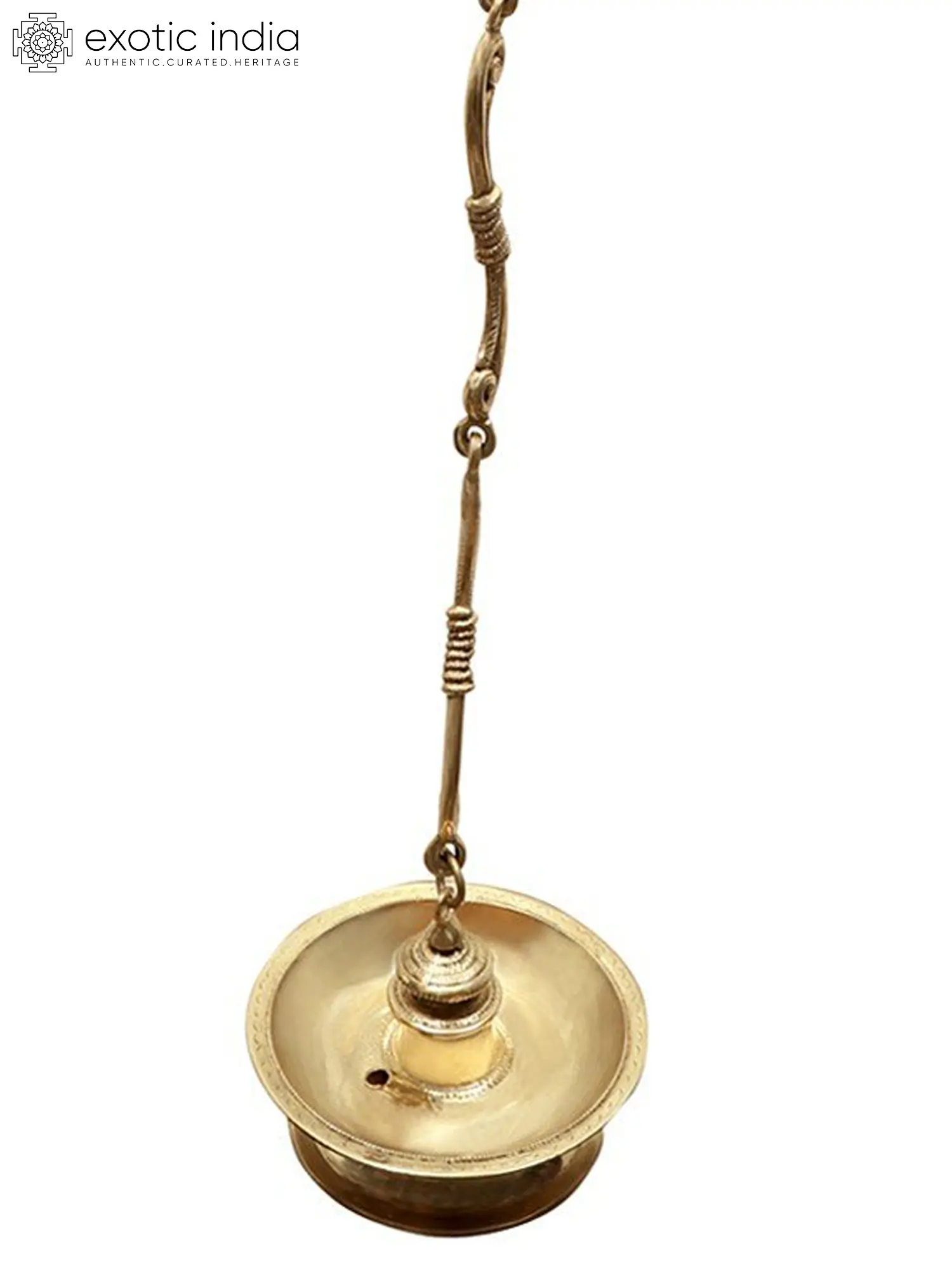 Suspended from the central, ornate panel is a traditional hanging diya, a vessel for oil and a wick, meant to be lit and offer a gentle, flickering illumination. The diya itself is a potent symbol in Indian culture, representing light over darkness, knowledge over ignorance, and hope over despair. Lighting a diya is an integral part of religious ceremonies, festivals, and daily prayers, inviting divine blessings and dispelling negative energies. This wall hanging elegantly integrates the celestial beauty of the peacock with the sacred glow of the diya, creating a piece that is both aesthetically pleasing and spiritually uplifting. The dynamic, articulated chain that leads to the diya adds a touch of fluidity, as if the light itself is dancing. ––––––––––