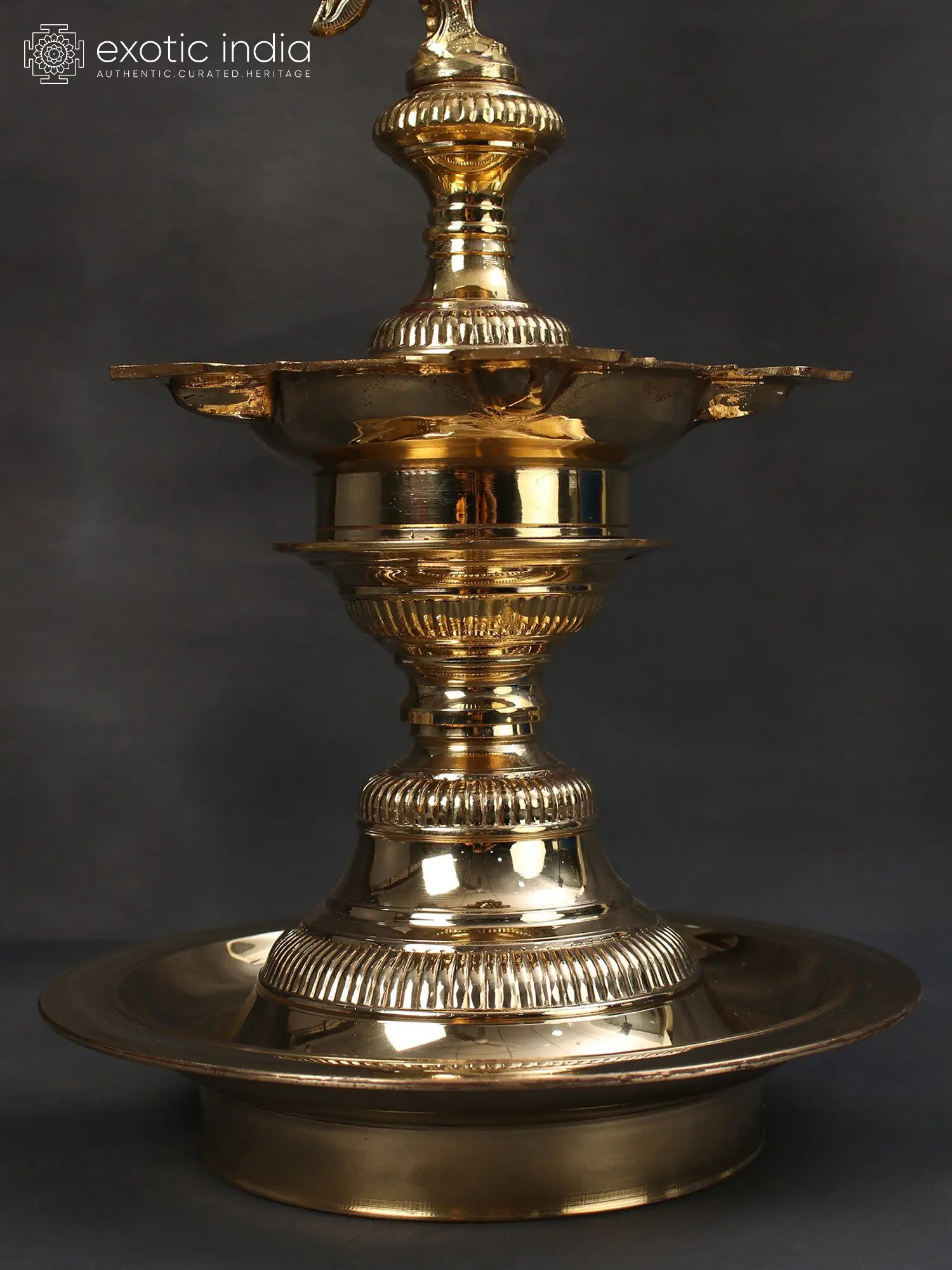 Peacock or Mayura has been given special importance in Indian literature, art, craft, and ritualistic traditions. Mayurasandesa a 16th-century poetic work by Uadaya is a collection of poems written on behalf of a loved one separated from his spouse and asks the peacock to turn messenger for him. This beautiful Vilakku or lamp made of brass and with a central motif of a peacock biting a branch is an epitome of growth and prosperity some of the features associated with peacock. This lamp with beautifully designed columns is a tribute to the grace and beauty of the magnificent bird called Mayura. The central oil basin contains five wicks. This lamp is generally lit in temples during festivals and is also used as a decorative item during festivals. Deepam, an important ritualistic object is provided with the auspicious image of a peacock and made a medium to bring good luck and prosperity to a house.