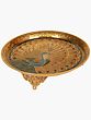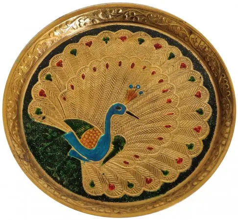 Each detail of this puja chowki speaks to the rich heritage of Indian artistry. The skilled artisans have poured their expertise into every curve and inlay, transforming a simple brass plate into a piece of functional art. The interplay of textures, from the finely etched feathers to the smooth, cool enamel, creates a tactile and visual delight. This chowki is more than just a decorative item; it is a testament to the enduring tradition of craftsmanship that seeks to imbue everyday objects with spiritual meaning and aesthetic beauty. It's a piece that not only serves its purpose but also adds a profound sense of culture and artistry to your home.