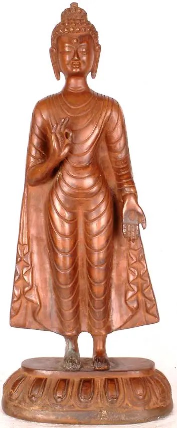 His right hand is raised in the gesture of granting fearlessness (Abhaya Mudra) and the second is in the wish-granting gesture (Varada Mudra). The three conch-like lines on the neck, the long ears, cranial protuberance, mark at the center of the forehead and the lotus pedestal, all are lakshanas (distinguishing features) of an enlightened being.