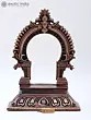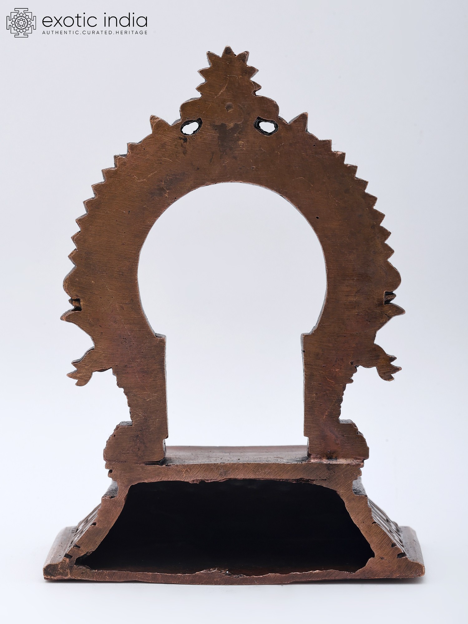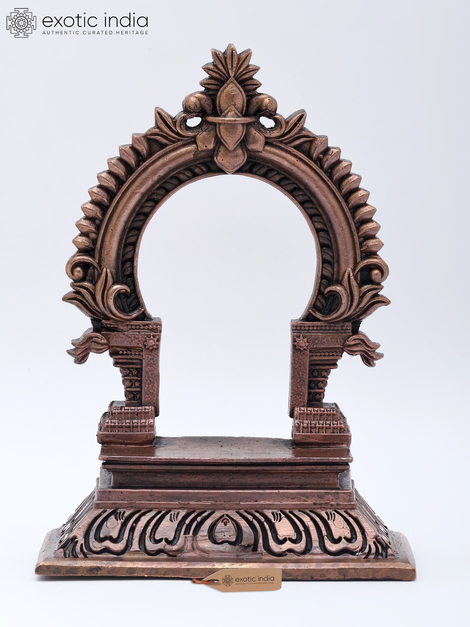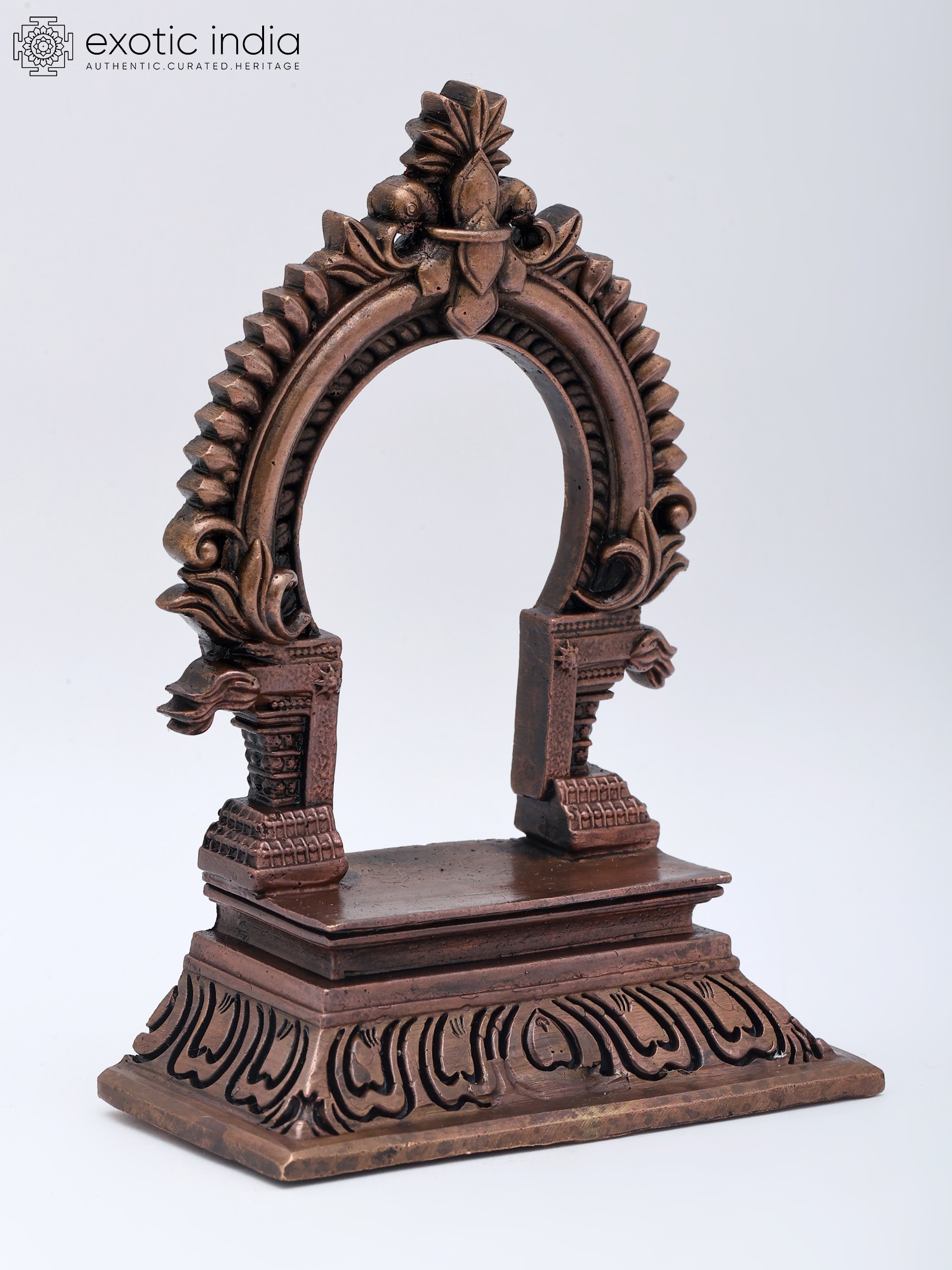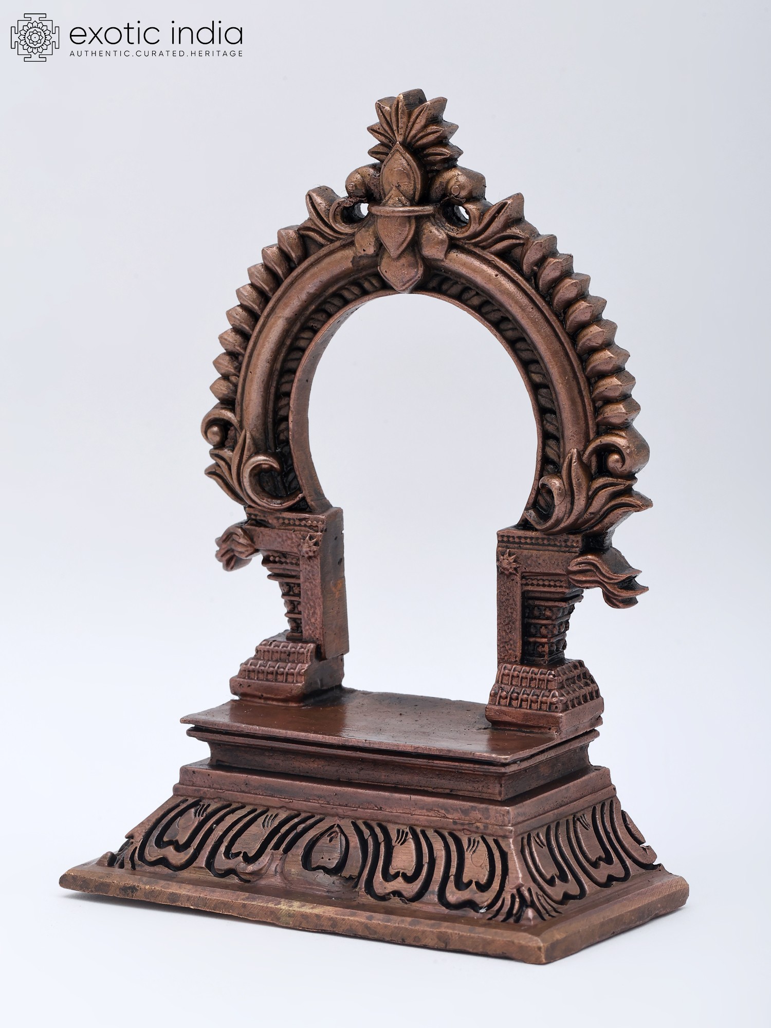 The design draws inspiration from temple architecture, featuring a majestic arch that cradles a central space, ready to house a deity. Adorning the arch are stylized floral motifs and swirling decorative elements, reminiscent of sacred iconography. The supporting pillars are intricately carved, showcasing miniature tiered designs, while the base features a captivating band of carved lotus petals, a powerful symbol of purity and spiritual awakening. The overall dimensions of 5.0 x 3.5 x 1.7 inches make it a versatile accent piece.