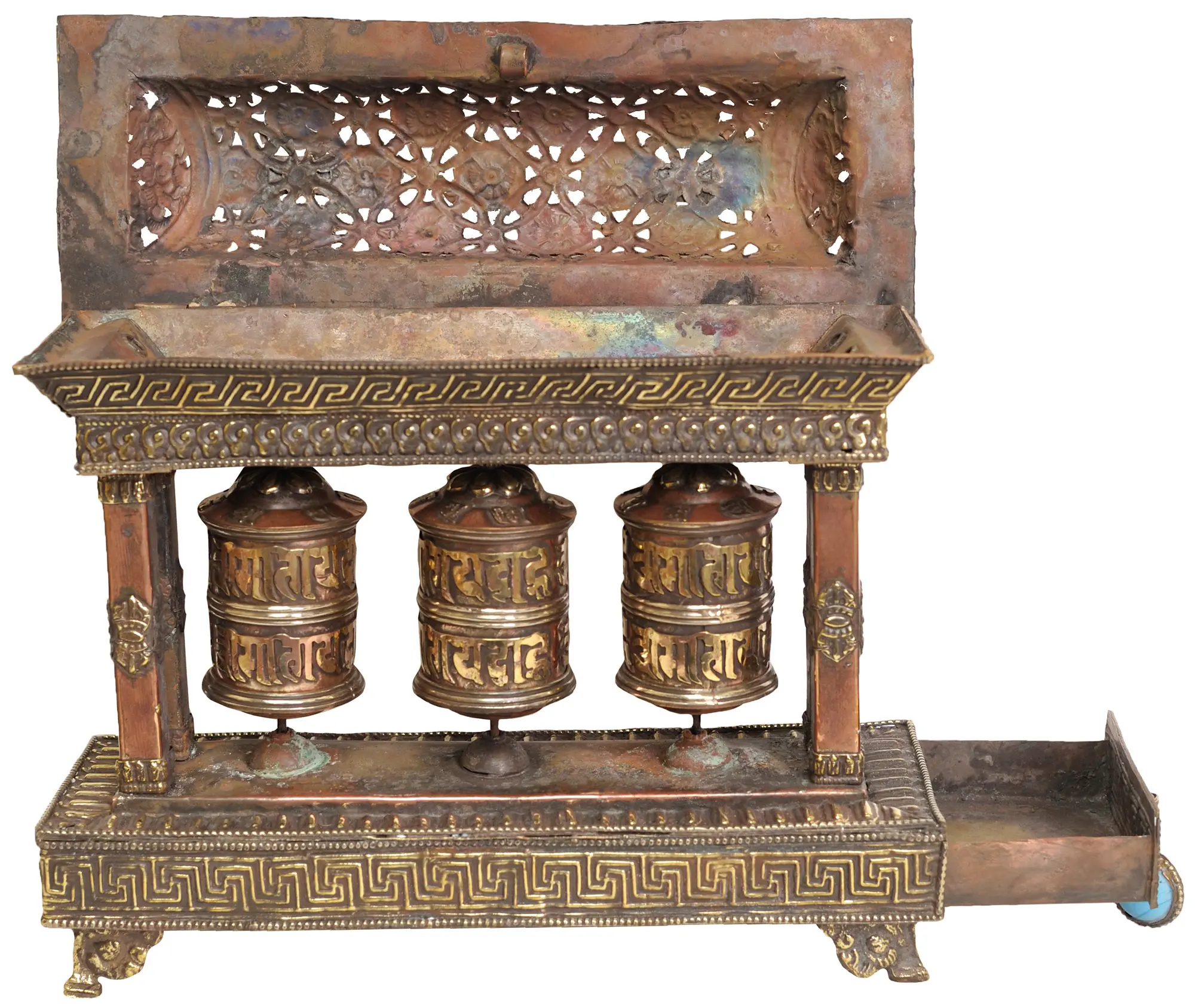 At the heart of this devotional piece are three prayer wheels, each meticulously crafted to hold sacred mantras. In Tibetan Buddhism, spinning a prayer wheel is believed to be equivalent to reciting the prayers written inside, spreading peace, wisdom, and compassion to all beings. The mantra commonly inscribed, "Om Mani Padme Hum," is a powerful invocation for the enlightened qualities of compassion and wisdom, associated with Avalokiteshvara, the Bodhisattva of Compassion. The act of turning these wheels with intention is said to purify negative karma, accumulate merit, and cultivate mindfulness. The elegant metallic sheen of the brass and copper catches the light, inviting contemplation and a sense of inner peace.
