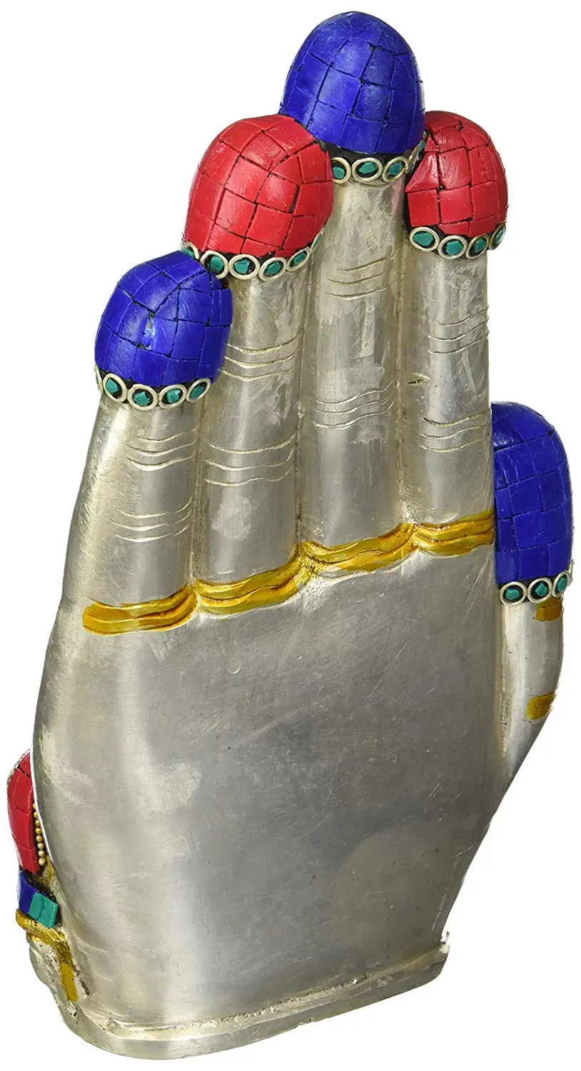 Crafted from high-quality brass, this statue is a testament to meticulous craftsmanship. The intricate details, from the delicate features of the Buddha's face to the textured surface of the palm and fingers, speak to the skill of the artisans. The careful inlay of lapis lazuli (blue), coral (red), and turquoise-like stones, set against the gleaming brass, creates a stunning visual appeal. This piece is not merely an object of decoration; it is a vessel of spiritual significance, bringing an aura of peace and mindfulness to any space. Its size makes it a versatile addition to a meditation corner, altar, or as a focal point in a room dedicated to spiritual practice or quiet reflection.
