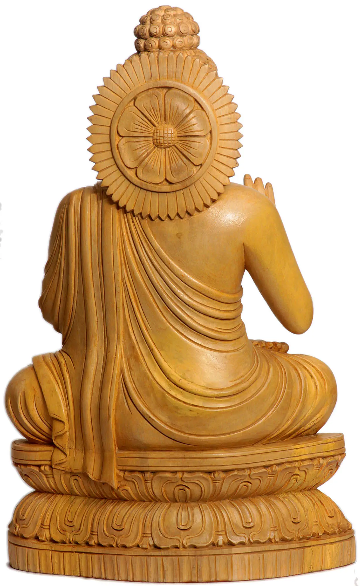 The Buddha is depicted in a classic pose, seated in the lotus position, the traditional asana of meditation. One hand is raised, displaying the Abhaya Mudra, a gesture of reassurance, protection, and dispelling fear. The other rests in his lap in the Dhyana Mudra, symbolizing deep meditation and inner peace. This combination of mudras powerfully illustrates the Buddha’s role as both a protector and a guide on the path to enlightenment. It evokes the historical moment when Siddhartha Gautama, having attained enlightenment, began sharing his insights with the world.