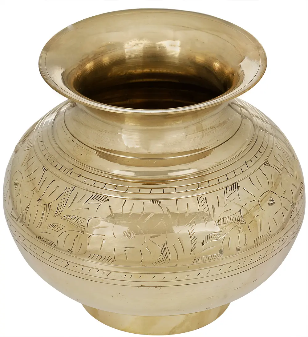 This exquisite brass vessel, a testament to the rich artisanal traditions of South India, embodies a profound spiritual significance. More than just an object, it is a Kalasha, a sacred pot revered in Hinduism and Jainism, symbolizing abundance, prosperity, and the divine. Its graceful, rounded form, with a gently flaring rim, is reminiscent of the cosmic egg, the primordial source from which creation is said to have sprung. The intricate etching of floral motifs and geometric patterns speaks to the deep connection between nature and the divine, a common theme in Indian iconography.