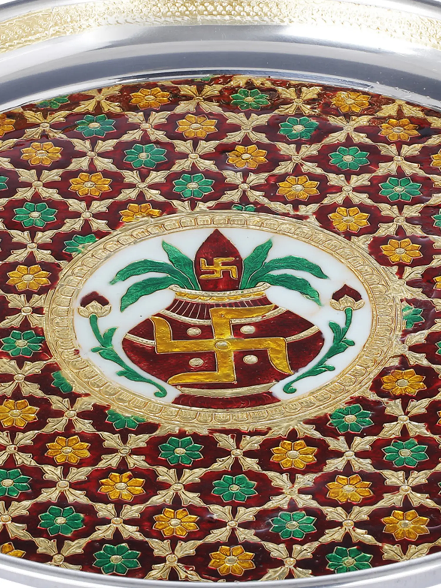 Enriched with deep symbolism, this Puja Thali with Meenakari work is one of the most creative approaches toward a utility item. A Puja Thali engraved with a Kalash is one of the most essential requirements of an Indian ritualistic event. The intelligent use of red, green, and yellow colors for the Meenakari work, brings a different feel of magnificence and divinity to the piece. The thali's rim is delicately embellished with gold decorations, offering a sense of richness. The Kalash at the centre is shown with a prominent Swastik sign, representing auspiciousness and wealth. The coconut atop the Kalash is also designed with a Swastik. On either side of the Kalasha, two delicate lotus blooms stand gently, symbolising purity and spiritual enlightenment. With its elaborate decorations and symbolic themes, this Puja Thali serves as a dignified serving item for religious ceremonies and worship.