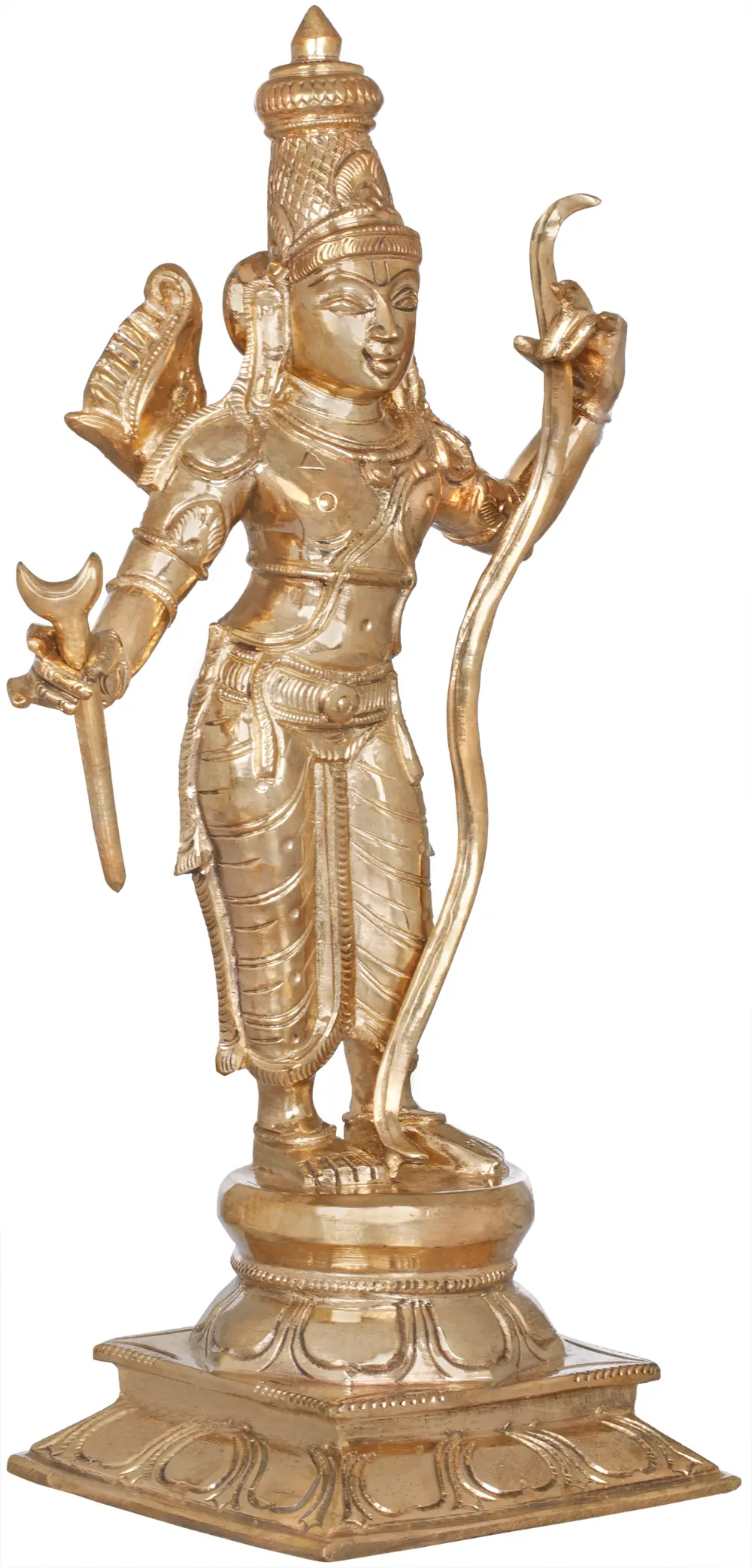 This panchaloha sculpture from Swamimalai, the home of India’s contemporary bronze sculptural tradition, depicts the Lord Rama as He was during His forest-dwelling years. The tall and handsome son of Lord Dasharatha bears a staff in His hands to help Him guide His wife and brother through the thick wilderness surrounding Ayodhya. He is clad in the silk dhoti that befits a prince. A narrow crown towers high above His head, keeping with traditional Southern iconography of the devas.