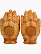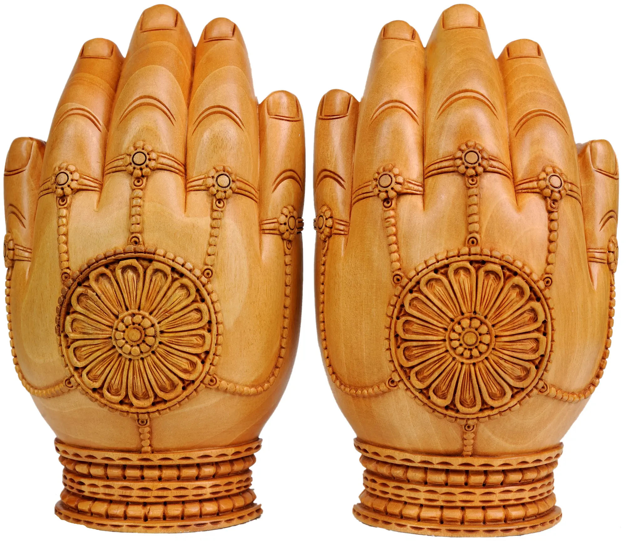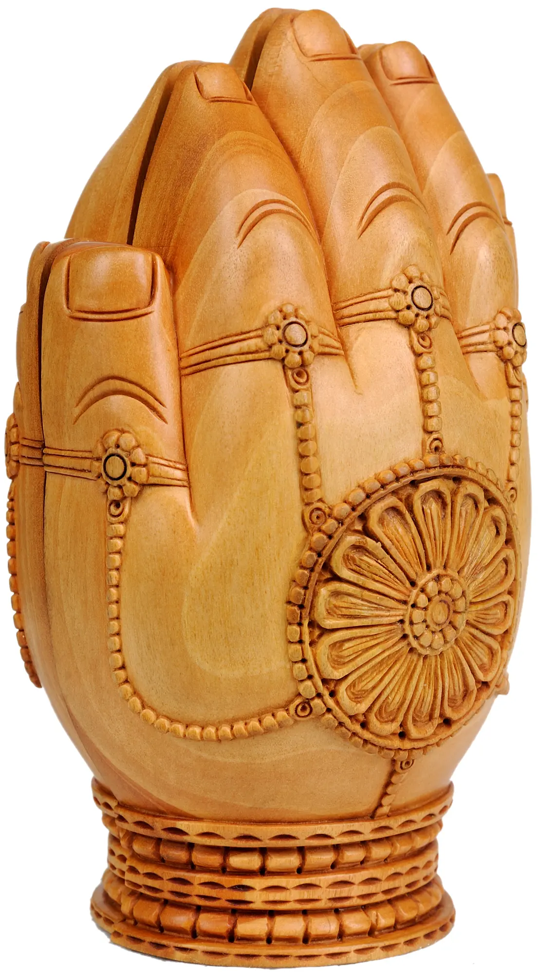 This exquisite wooden carving captures the eternal love and divine play of Radha and Krishna. Crafted from the fine Kadamba wood, a material deeply revered in Indian traditions for its sacred associations, this sculpture is a testament to the skilled artistry originating from the historic city of Jaipur. Each detail, from the serene expressions to the intricate drapery, has been meticulously hand-carved, imbuing the figures with life and grace. The unique "carved in hands" design not only symbolizes protection and divine embrace but also offers a striking aesthetic, presenting the divine couple cradled within stylized hands.