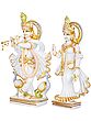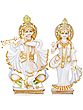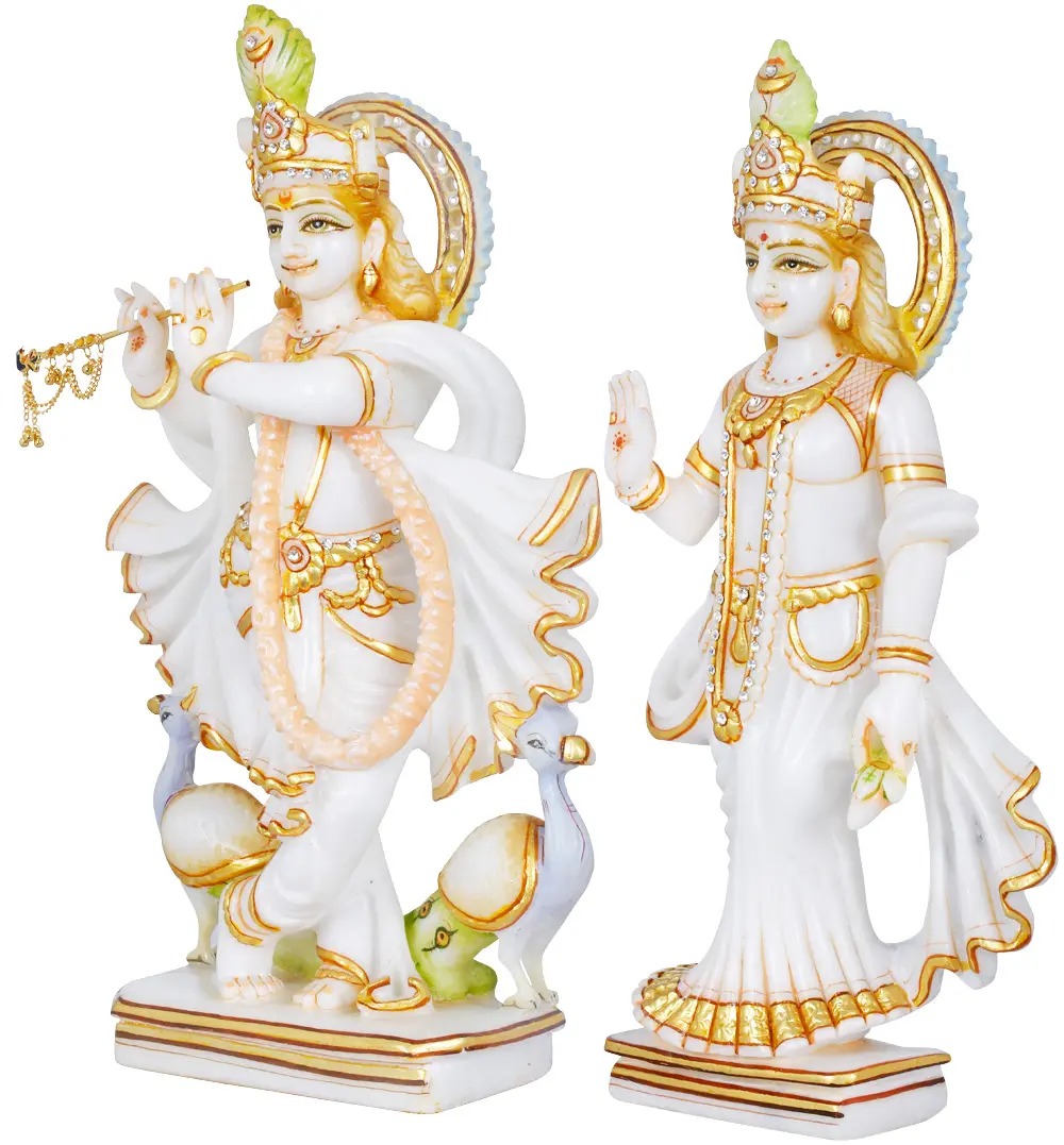 Beside him stands Radha, the epitome of selfless devotion and unwavering love for Krishna. Her serene expression and graceful stance convey her deep spiritual connection and adoration. Her hands are raised in a gesture of blessing and welcome, her fingers delicately holding a lotus, a sacred flower symbolizing purity, spiritual awakening, and divine beauty. In the Puranas, Radha is revered not merely as Krishna's lover, but as his eternal companion and the embodiment of the soul's longing for the divine. Their union is seen as the ultimate representation of Bhakti Yoga, the path of devotion, where love for the divine becomes the supreme goal of life. The intricate gold detailing that adorns their attire, from the crowns to the borders of their garments, adds a touch of regal splendor, elevating this divine pair to a celestial status. This statue is more than just an art piece; it is a conduit to the spiritual essence of Radha and Krishna's divine love, a timeless representation of devotion, joy, and eternal bliss. It serves as a beautiful reminder of the profound and multifaceted nature of divine love, inspiring peace and contemplation in any space it graces.