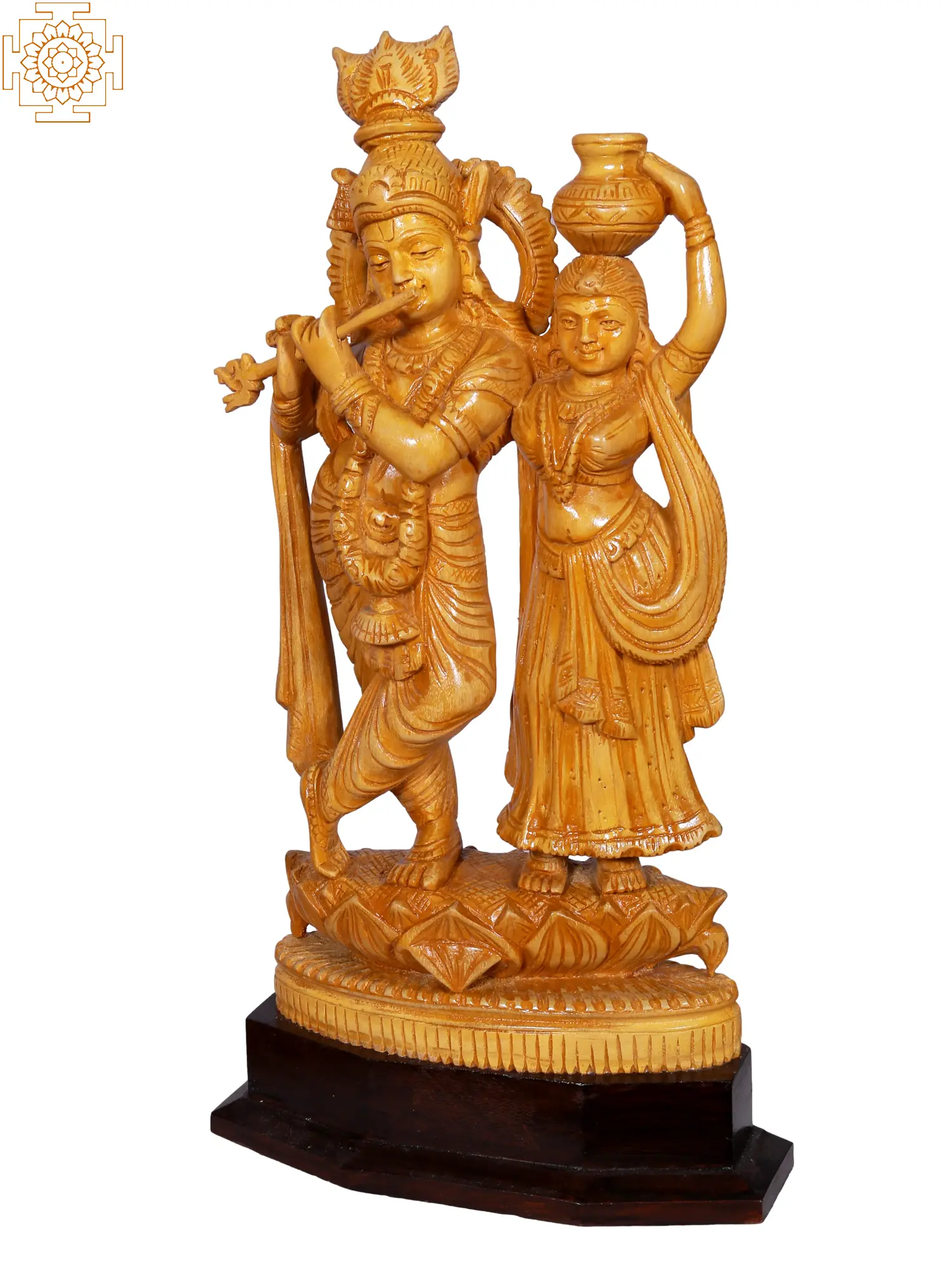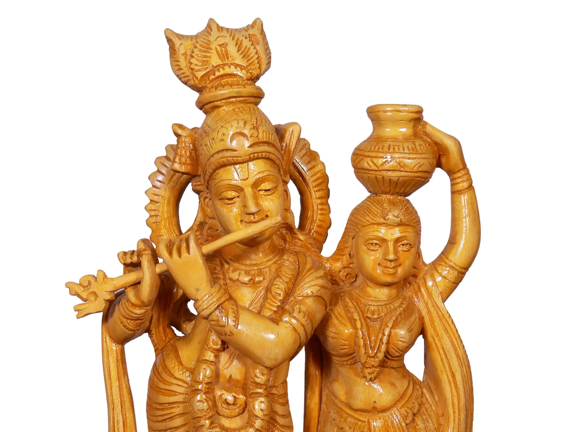 It is a wood-sculpted composition of Hinduism’s timeless lovers. Imbued with life and a rich proportion of detail. The stance of the Lord is in tribhanga: His form is laterally jutting out (‘bhanga’) in three (‘tri’) different places. The language of Radha’s body unmistakably conveys rhythm and motion - and dance.