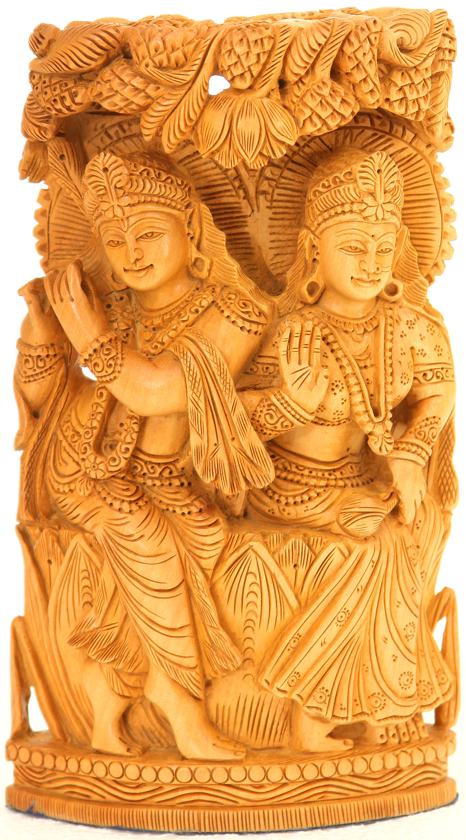 Meticulously hand-carved from Kadamba wood in Jaipur, India, this sculpture embodies the rich artistic heritage of the region. The fine detailing showcases the artisan’s skill and devotion to the subject. From the intricate jewelry adorning Radha and Krishna to the gentle expressions on their faces, every aspect reflects a deep understanding of the mythology and symbolism behind their forms. The texture of the Kadamba wood lends a warm, earthy tone to the piece, enhancing its visual appeal and tactile quality. The craftsmanship and natural material create a tangible link to centuries of artistic tradition, making this a unique and spiritually enriching addition to any home. The sculpture captures the essence of Radha and Krishna's divine connection through their posture and facial expressions, reflecting their eternal love and playful dynamic. The serene ambiance they radiate can bring peace and harmony to any space. Owning such a sculpture is not merely about possessing an art object; it is about inviting the divine love and spiritual energy of Radha and Krishna into one's life. It is a reminder of the path of devotion, surrender, and the ultimate union with the divine.
