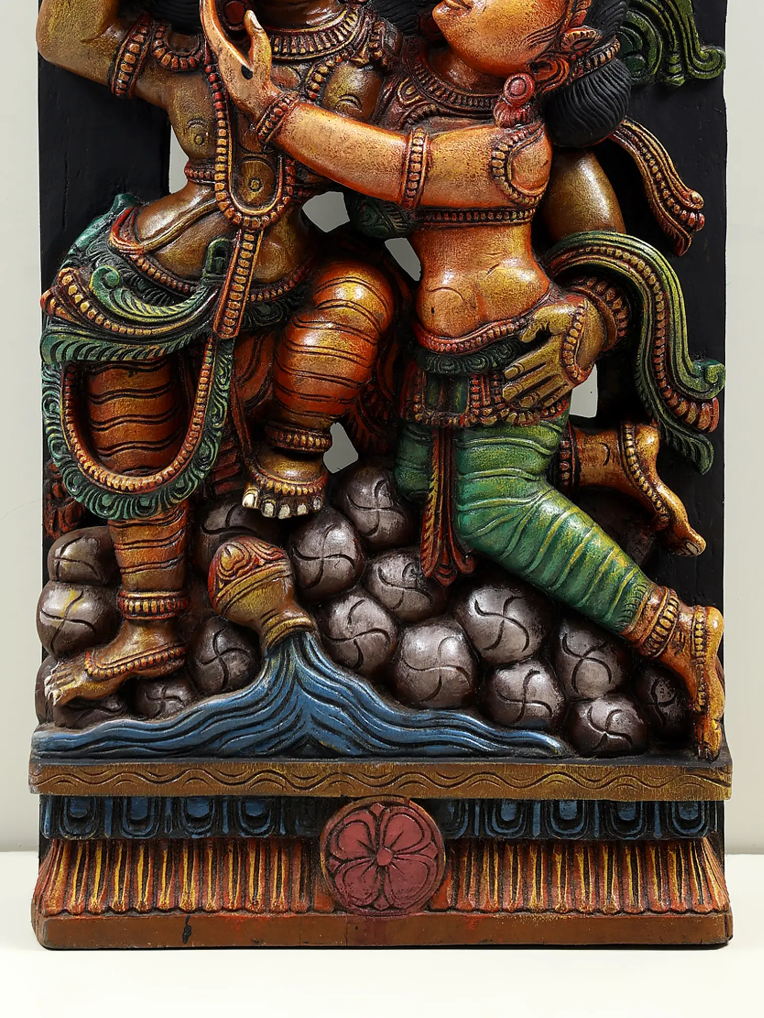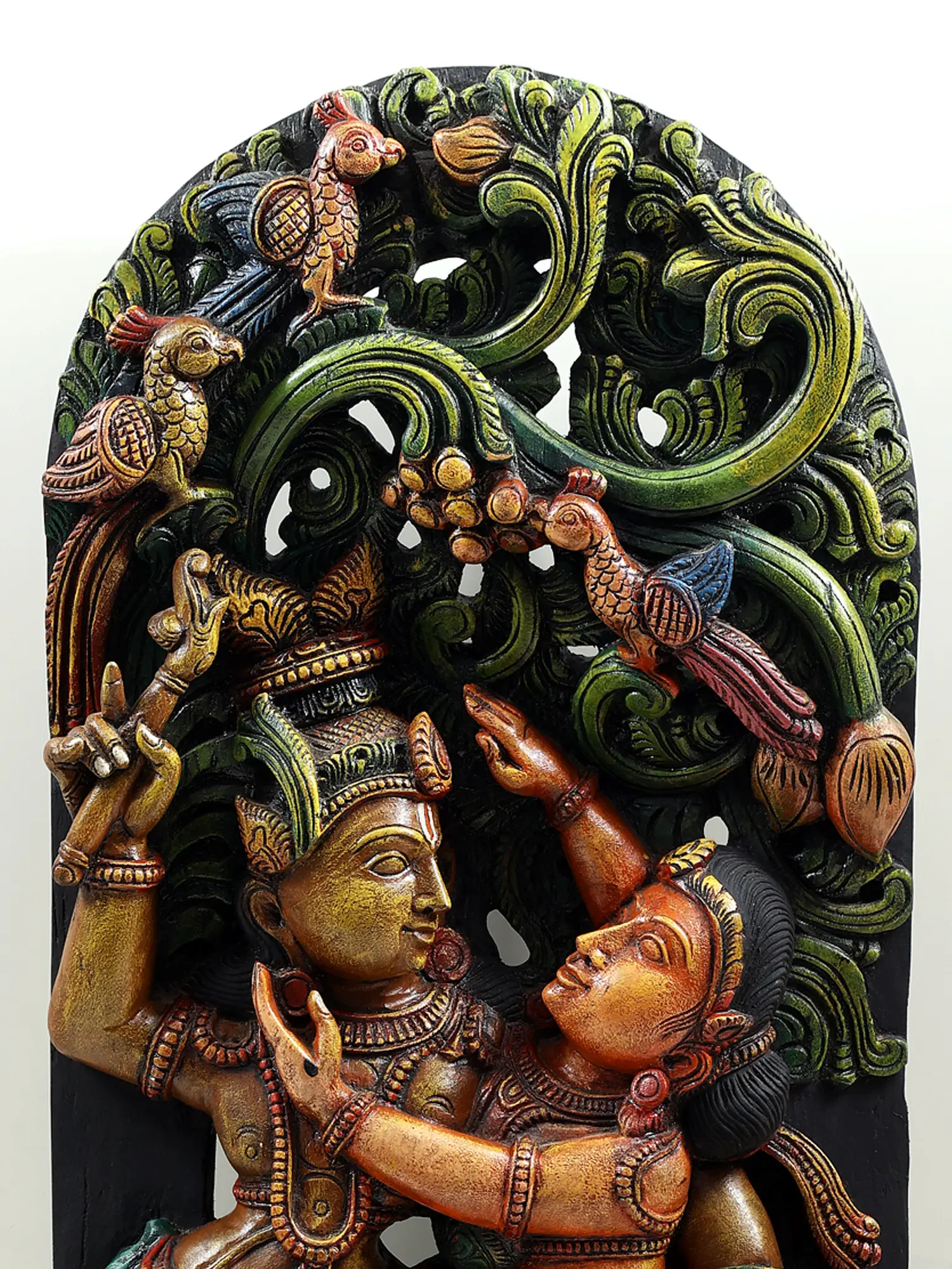 Originating from the esteemed traditions of South Indian temple art, this carving is a testament to a lineage of craftsmanship passed down through generations. Such intricate wood sculptures often adorned the walls and pillars of ancient temples, serving as visual narratives for devotees. The use of vibrant natural pigments not only enhances the aesthetic appeal but also holds symbolic significance in Hindu iconography. The deep greens of the foliage evoke the lushness of nature, while the warm earth tones and bright reds and yellows of the divine figures reflect their divine radiance and auspiciousness. Each curve, each fold of cloth, and each expression is meticulously carved, reflecting a deep understanding of form and emotion. This piece is more than just an artifact; it is a conduit to the divine, a tangible representation of the spiritual fervor and artistic brilliance that define South Indian cultural heritage.