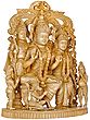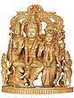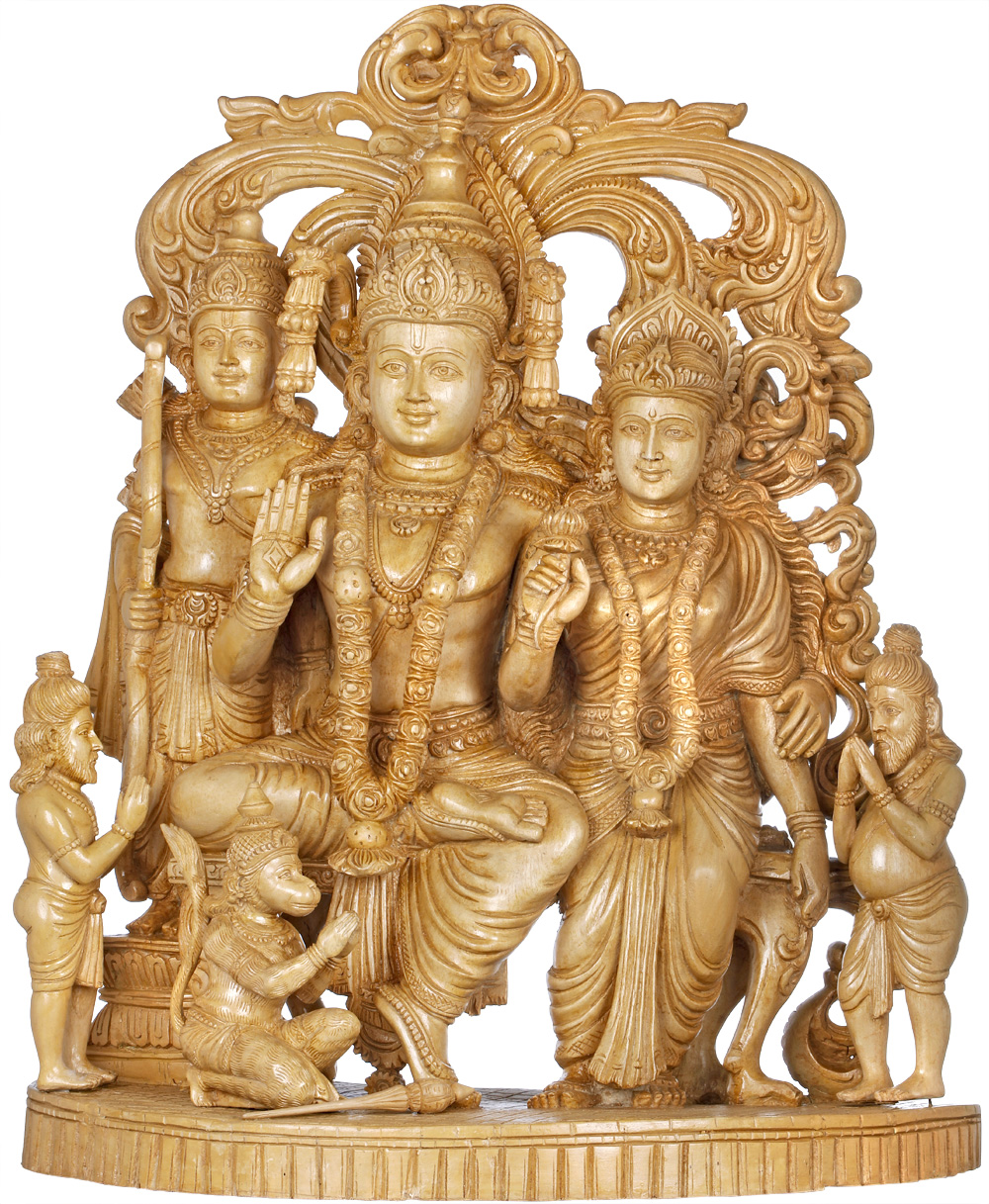 This exquisite wooden sculpture, originating from the skilled artisans of South India, captures the essence of the revered Rama Durbar, a tableau that embodies righteousness, devotion, and familial harmony. At the heart of the composition sits Lord Rama, the seventh avatar of Vishnu, renowned for his exemplary dharma, courage, and unwavering adherence to duty. His serene countenance, radiating divine grace, is a testament to his role as a benevolent ruler and protector. Beside him, his devoted wife, Sita, embodies purity, strength, and wifely virtue. Her gentle presence complements Rama's regal stature, symbolizing the eternal bond of love and loyalty. ––––––––––––––––––