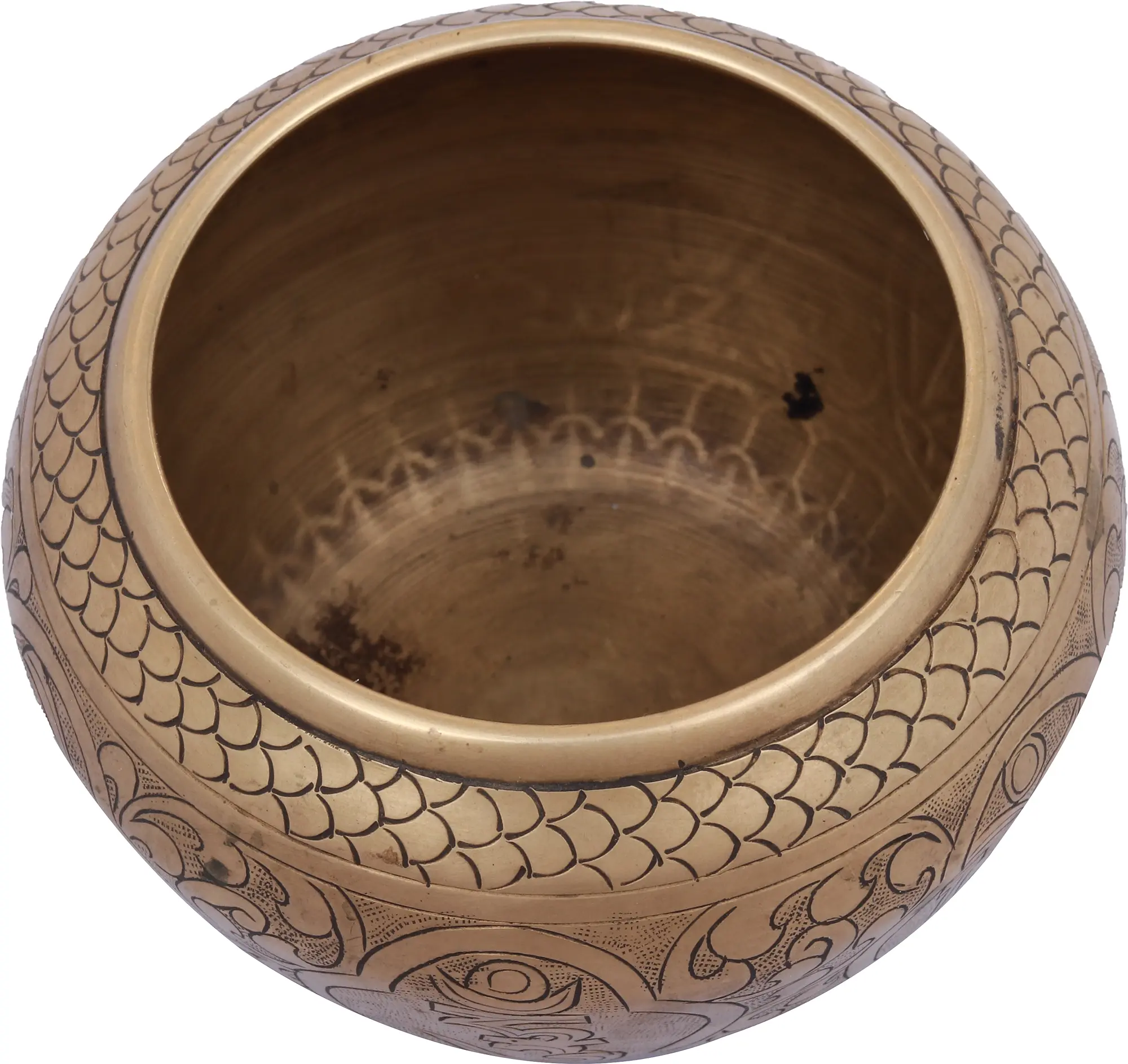 This exquisite ritual bowl, meticulously crafted in Nepal, is more than just a beautiful object; it is a conduit for spiritual energy and a testament to the rich cultural heritage of Tibetan Buddhism. Formed from durable brass, its surface is intricately engraved with sacred mantras and auspicious symbols, each carrying profound meaning and the power to inspire peace and well-being. The scales motif encircling the upper rim evokes the protective and benevolent power of the Naga, mythical serpent beings often associated with water, treasure, and spiritual wisdom in ancient traditions.