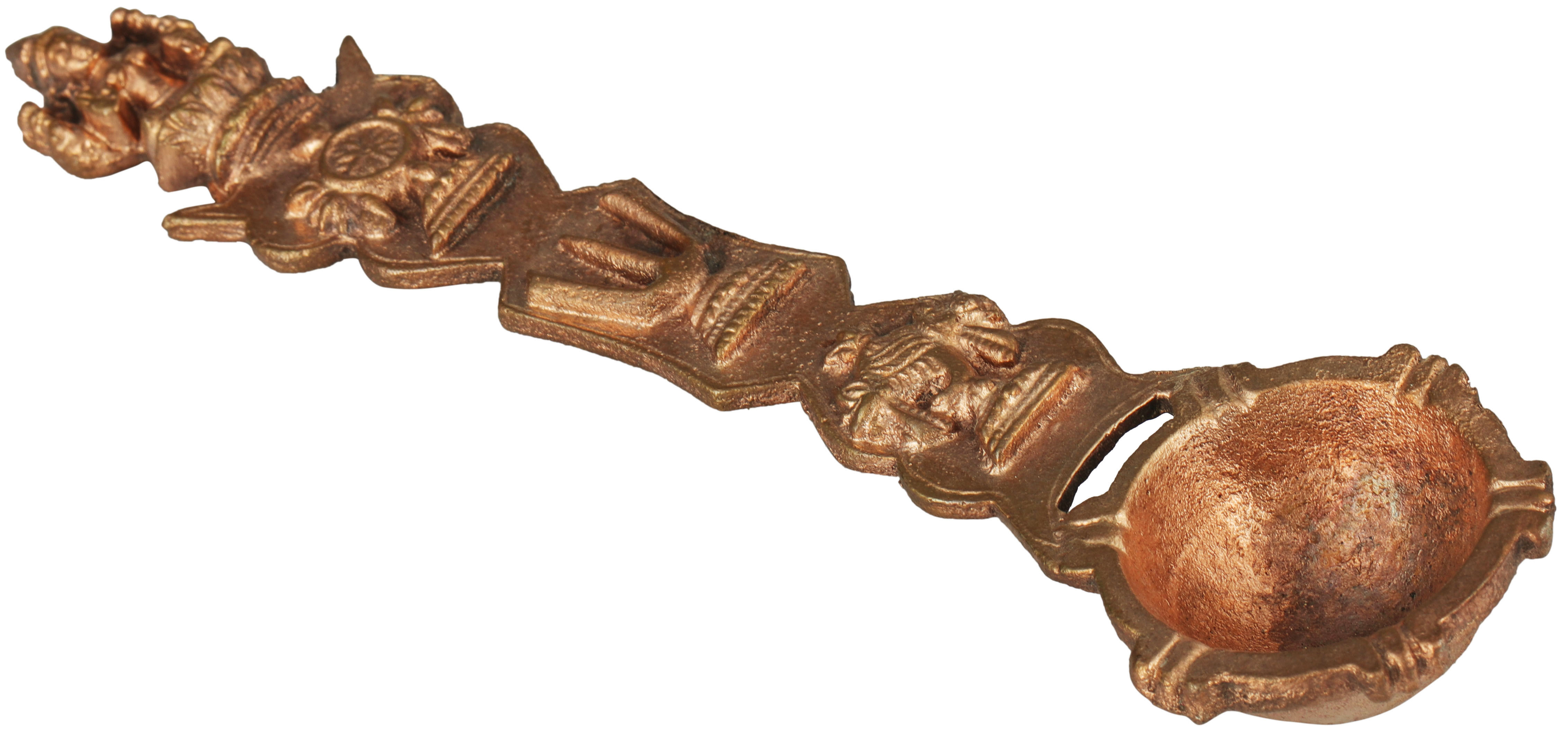 The meticulous craftsmanship evident in this copper statue speaks volumes about the skill of the artisans who created it. Each detail, from the divine faces to the sacred symbols, is rendered with precision, reflecting a deep understanding of iconography and spiritual aesthetics. Copper artifacts have been treasured in India for millennia, used in everything from temple deities to everyday utensils, due to their perceived spiritual and health benefits. Owning a piece like this is not just about possessing an object of art; it is about connecting with a rich cultural heritage that has been passed down through generations, a heritage that celebrates devotion, prosperity, and the divine. This ritual spoon serves as a beautiful reminder of these enduring values.
