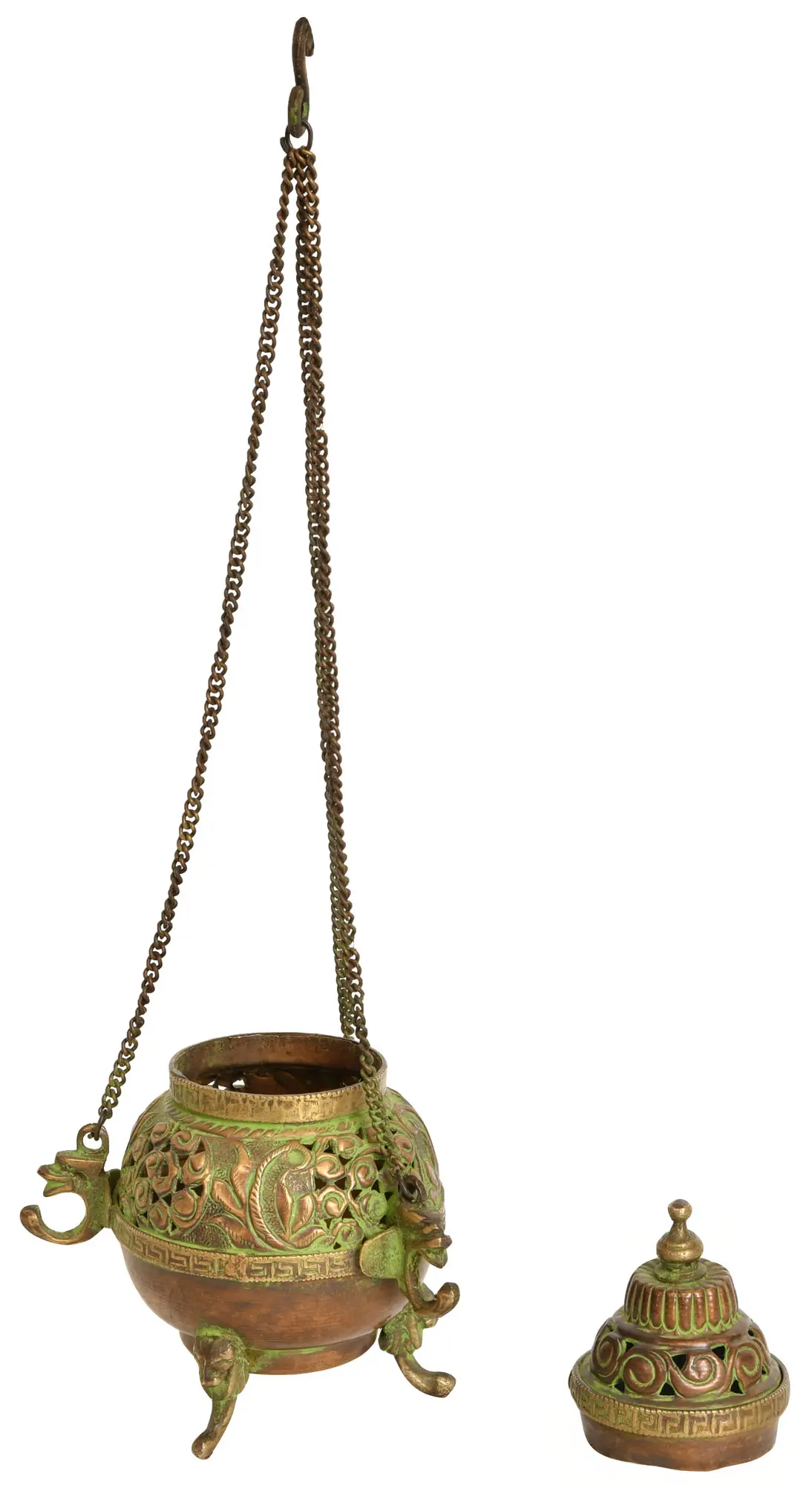 The craftsmanship evident in this burner is a testament to traditional metalworking techniques. The copper, a material often associated with purity and conductivity in spiritual practices, has been meticulously shaped and adorned. The delicate filigree work allows the fragrant smoke to wisp out, creating a mesmerizing visual display as it fills the air. The three sturdy legs provide a stable base when not hung, while the robust chain ensures secure suspension. The green patina, a natural result of the copper's interaction with the environment over time, adds a unique character and depth, suggesting a venerable object steeped in history and spiritual energy.