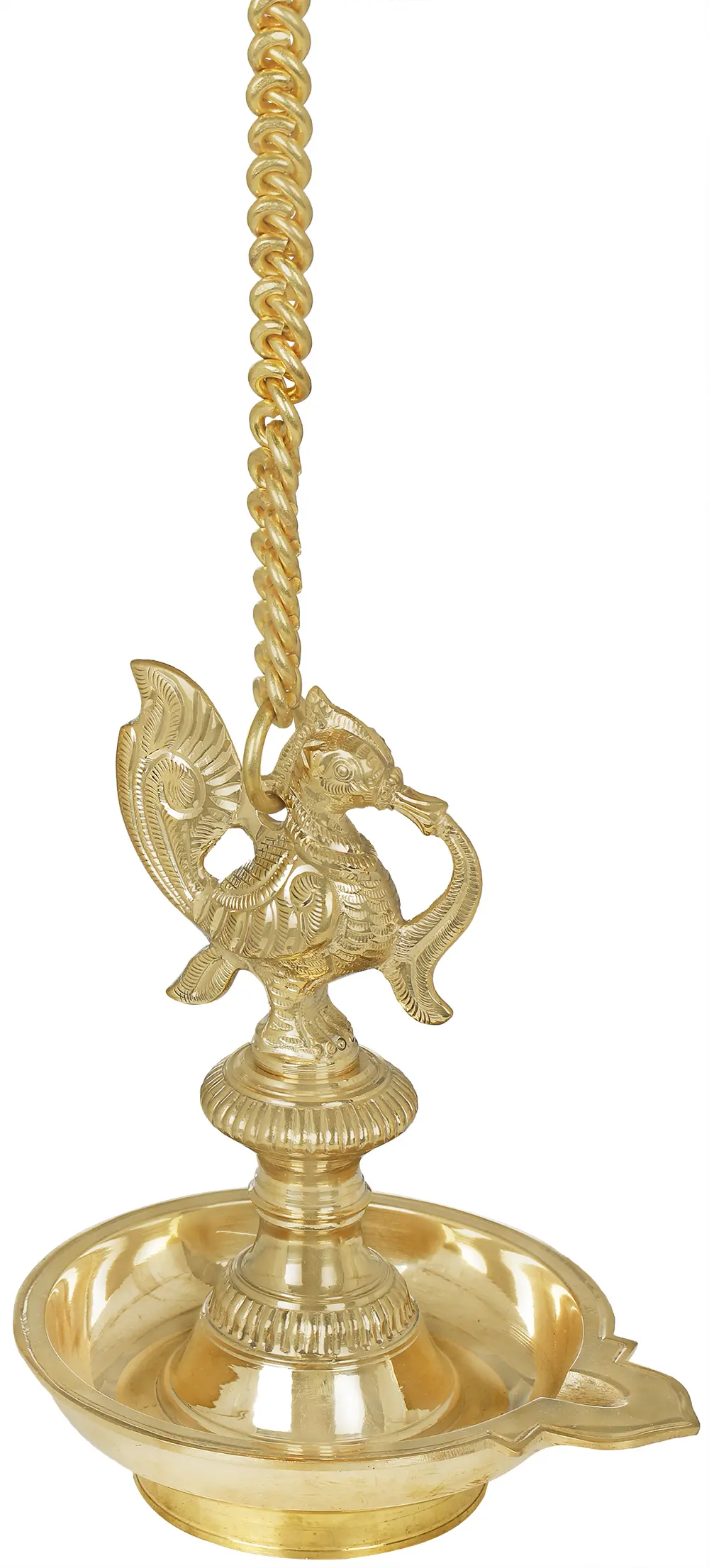 Pooja lamps are a remarkable origin from South India and is used a source of illuminator of all forms of knowledge being greater than wealth. A lamp is lit before starting with any kind of auspicious event as the light that emerges out from it is the light of divinity, wisdom, intellect and a path to the lord himself. The one shown on this page is sculpted out of a superfine brass material in typical South Indian style carvings. Its light golden color, smooth and glossy texture enhances the intricacies of the beautiful carvings. You can hang this lamp on the roof using the double locked solid chain at the top and diya will be lighted in deep bowl-like structure at the bottom.