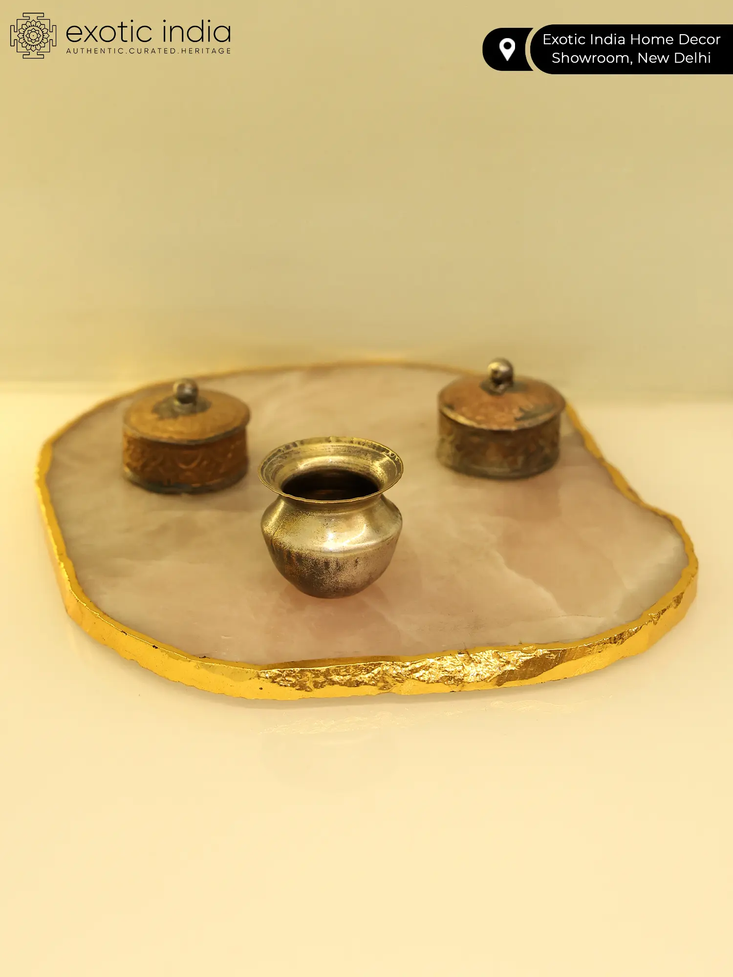 The rose quartz was chosen for this plate because of its reputation for fostering love, healing, and harmony. This wonderful piece is made even more elegant by the gorgeous pink tint of the stone. Additionally, it is thought to have a relaxing effect and encourage serenity. This exquisite gift box-accompanied Rose Quartz Plate with Kumkum Box and Gangajali is likely to become a cherished addition to your collection.