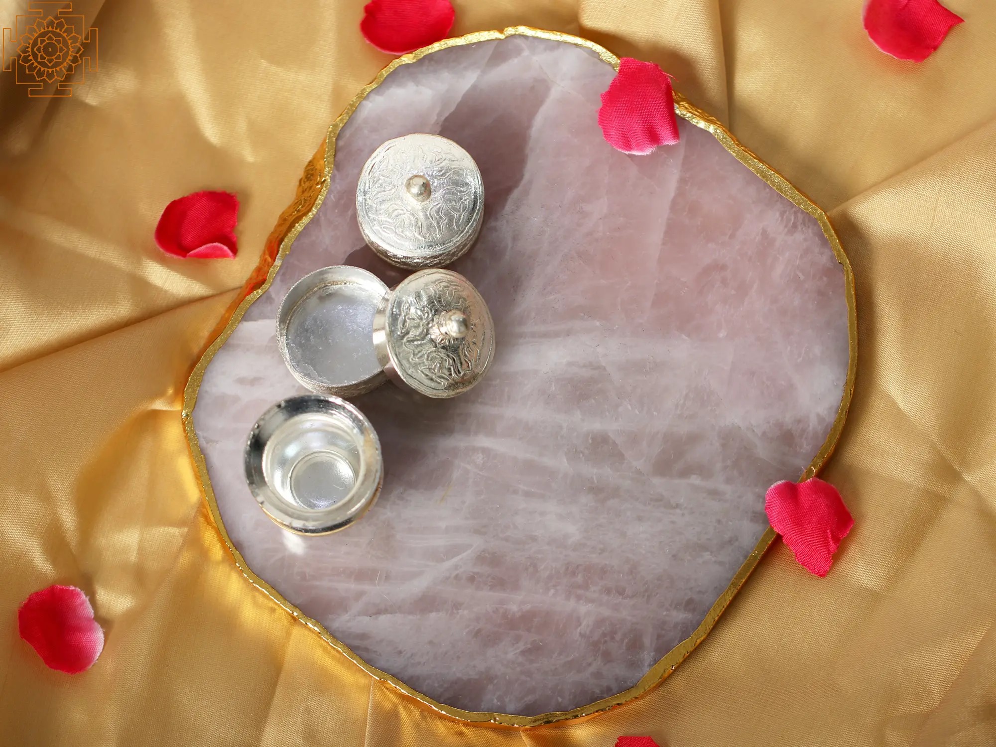 The gorgeous Rose Quartz Plate with Kumkum Box and Gangajali is ideal for adding grandeur to your home decor or as a thoughtful present for a loved one. This sterling silver-plated plate is made of premium rose quartz and is strong and elegant. This plate is a wonderful addition to any prayer room or sacred place because the Kumkum Box and Gangajali, which are both included, are commonly used in Hindu rituals.