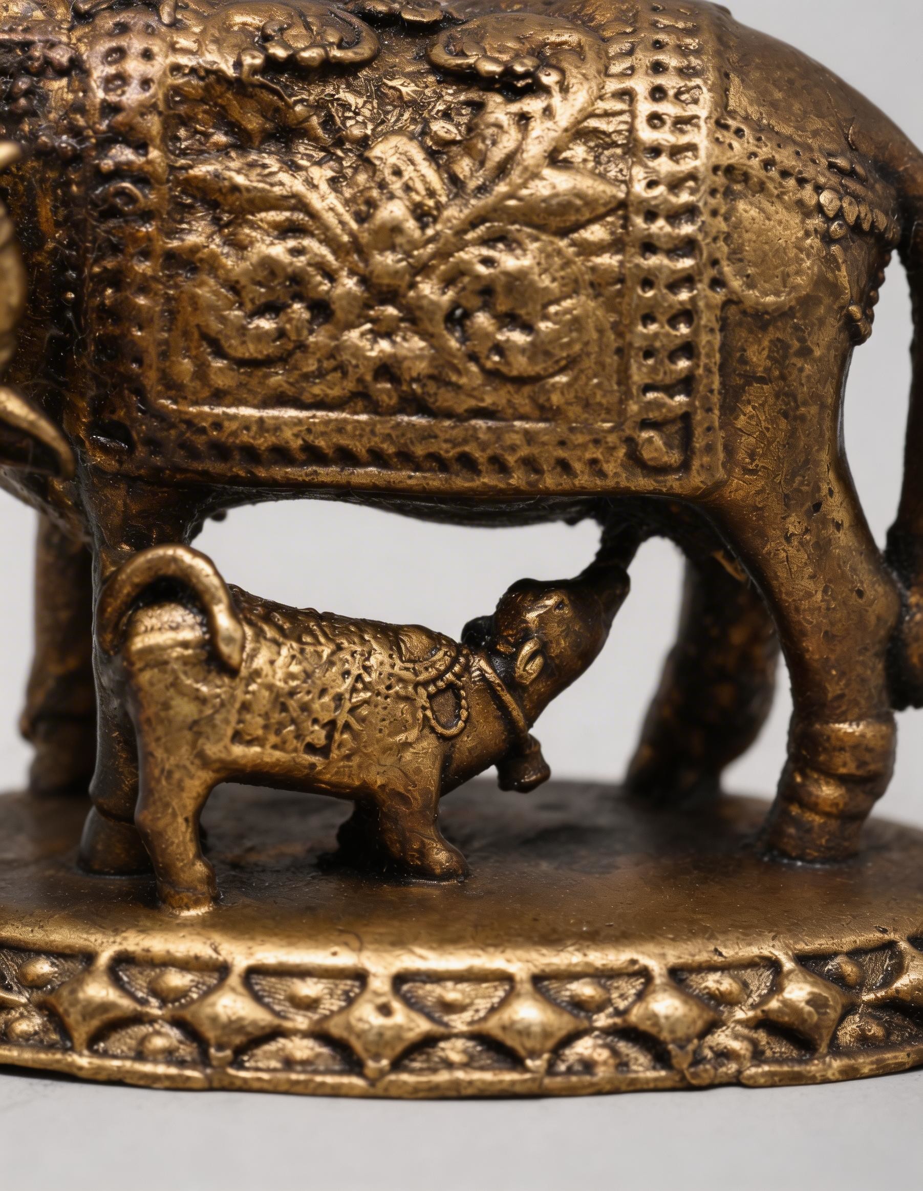 The detailed ornamentation on the cow's blanket and the calf's adornments showcases skilled craftsmanship.