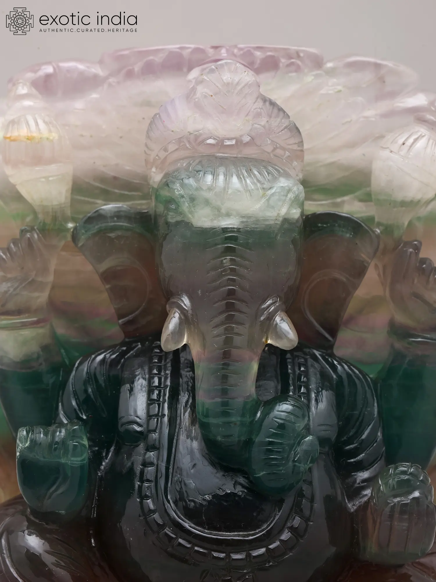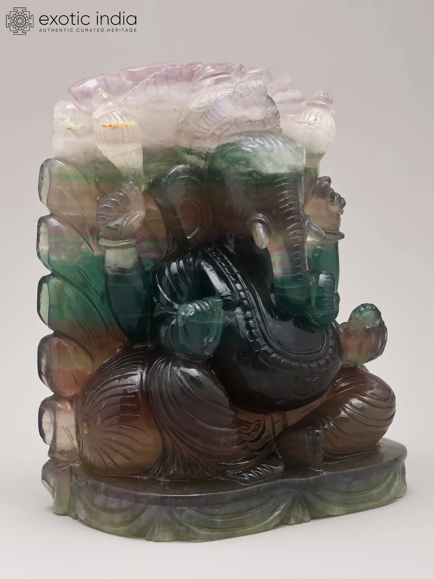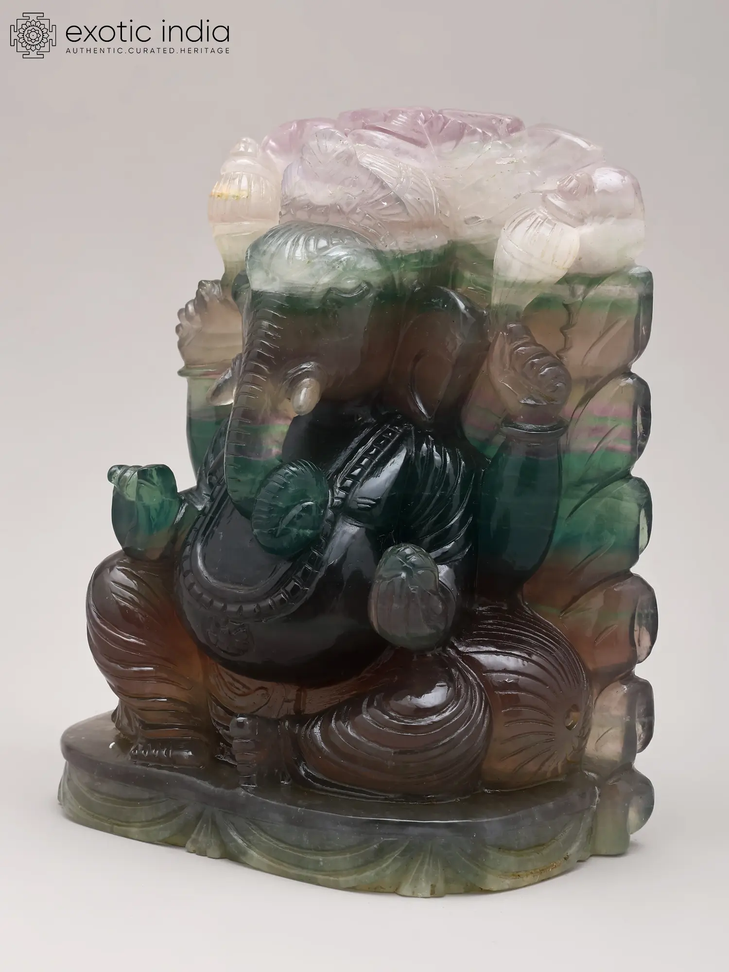 Observe the captivating interplay of colors within the semi-precious stone, transitioning from deep emerald greens and rich ambers to ethereal lavenders and crystal clears. This natural palette imbues the deity with a vibrant, living aura, enhancing its divine appeal. The careful carving of its features, from the gentle curl of the trunk to the serene expression, speaks volumes of the artisan's skill and devotional spirit. This piece, measuring approximately 6.5 inches tall, 5.0 inches wide, and 3.0 inches deep, is sized to command attention without overwhelming your chosen space.