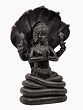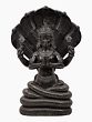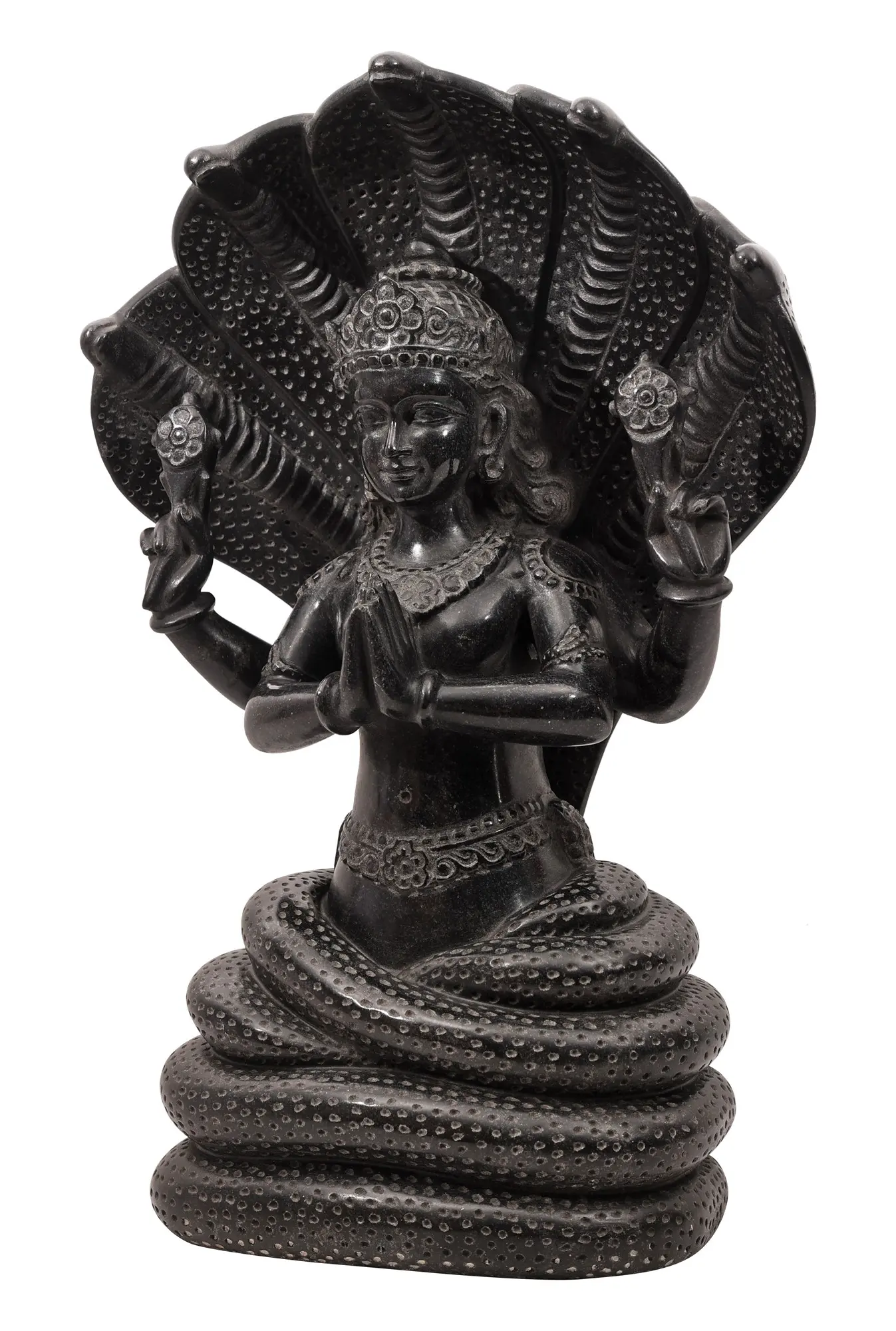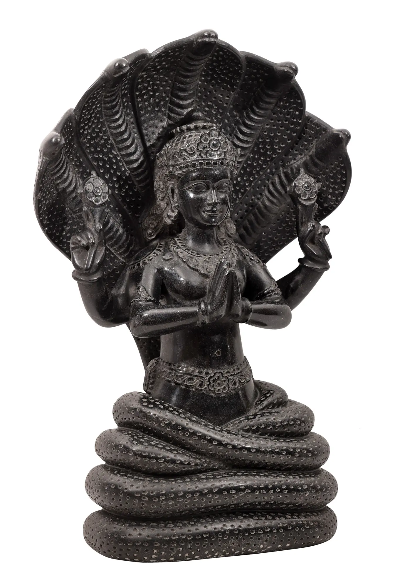 Posterior hands hold the iconic implements with the head embellished in a royal crown. Keeping intact the realistic features, the serpent body is amazingly etched with dot motifs all over and striations in the inner side of the hood. Place this black stone Patanjali sculpture at your entrance gates for a warm and beautiful welcome to your guests.s