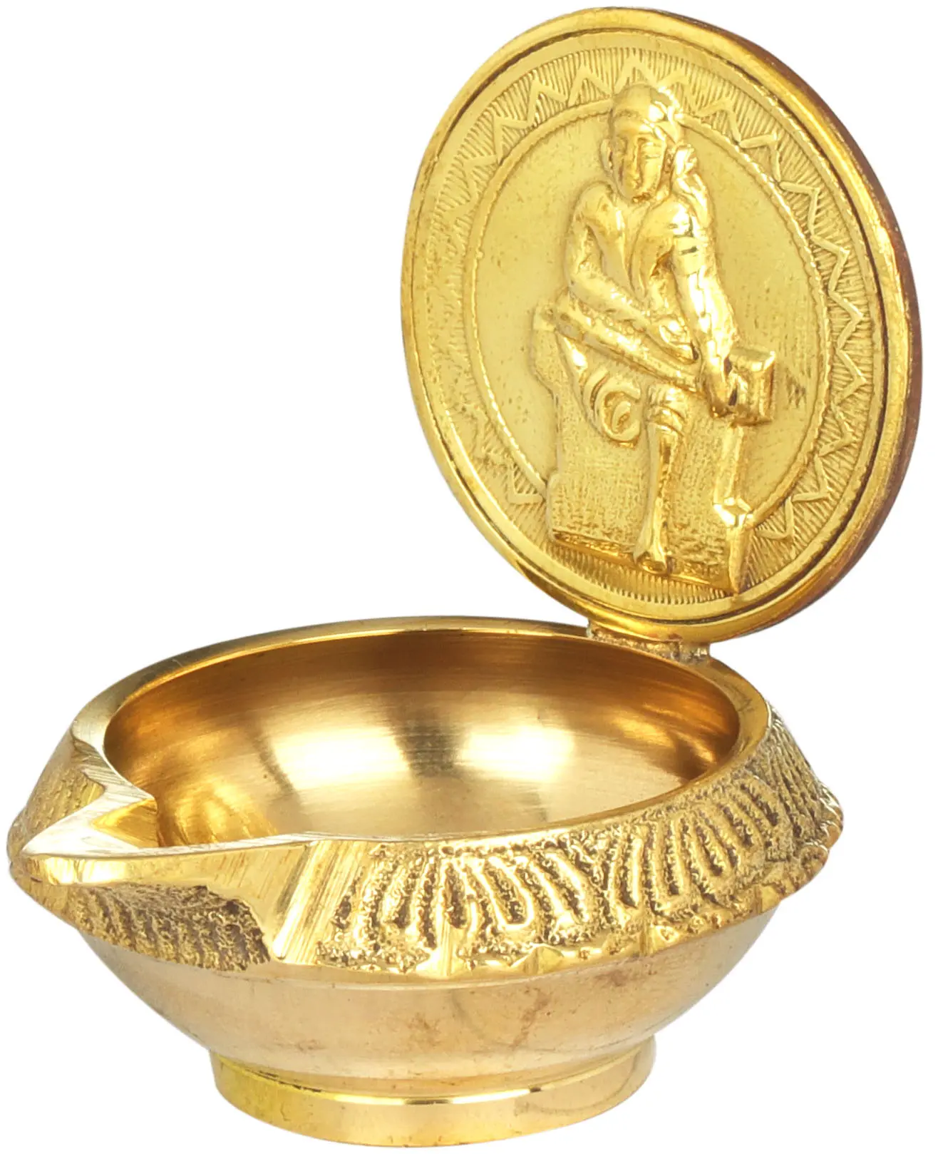 Sai Baba of Shirdi, a beloved saint and spiritual master, is revered by millions worldwide for his teachings of love, service, charity, and inner peace. His message, "Sabka Malik Ek" (One God governs all), transcends religious boundaries, fostering unity and understanding. This diya, featuring his benevolent form, serves as a constant reminder of his presence and his teachings. The intricate detailing on the diya, particularly the decorative band around its rim, adds to its aesthetic appeal, while the polished brass surface reflects the light beautifully, creating an aura of sanctity. Whether placed on an altar, a meditation corner, or a puja mandir, this diya emanates a powerful sense of spiritual energy, inviting peace and positive vibrations into your environment. It is a perfect accompaniment for your daily prayers, meditation sessions, or special ceremonies.