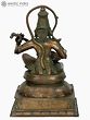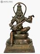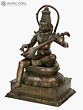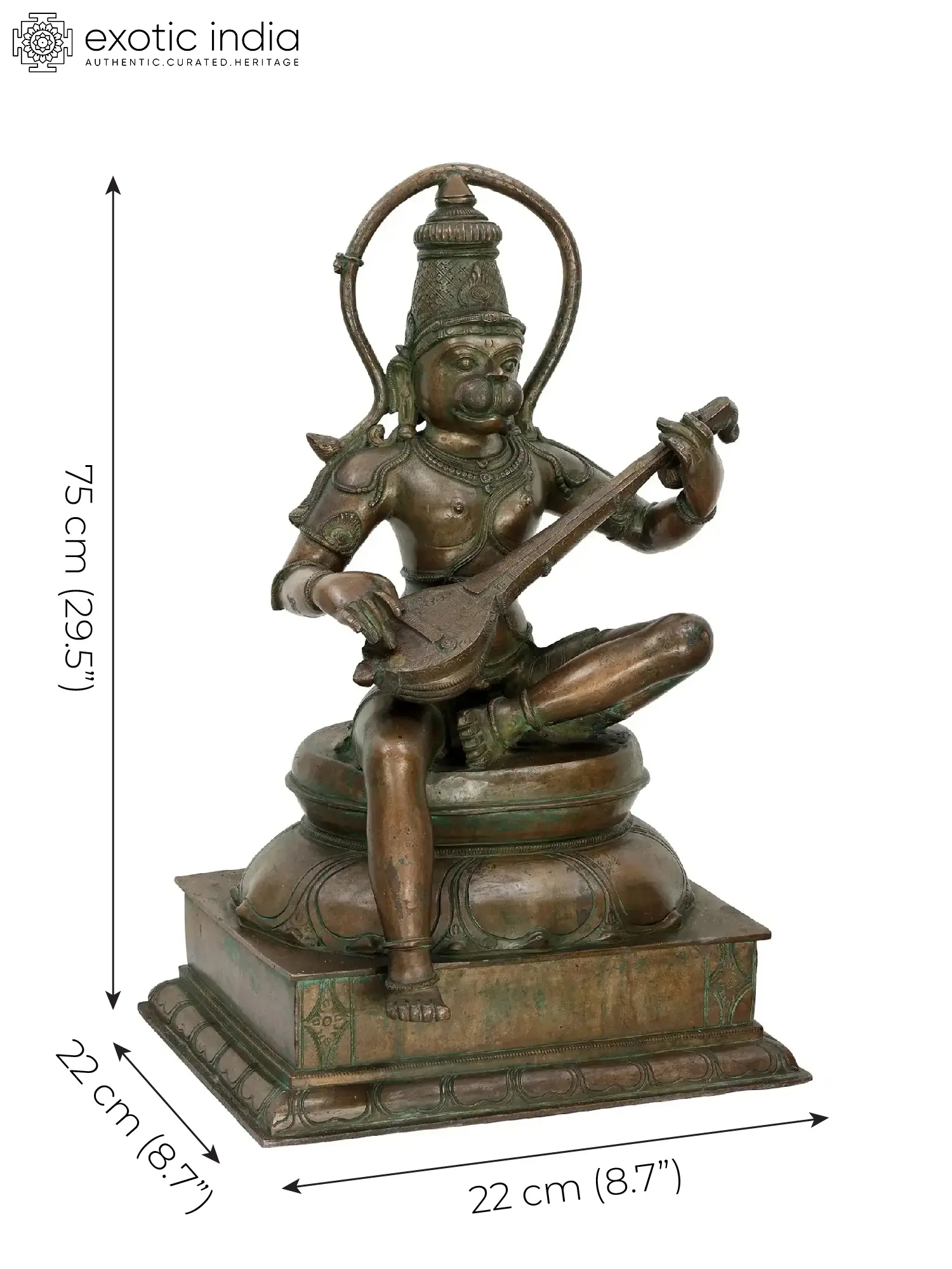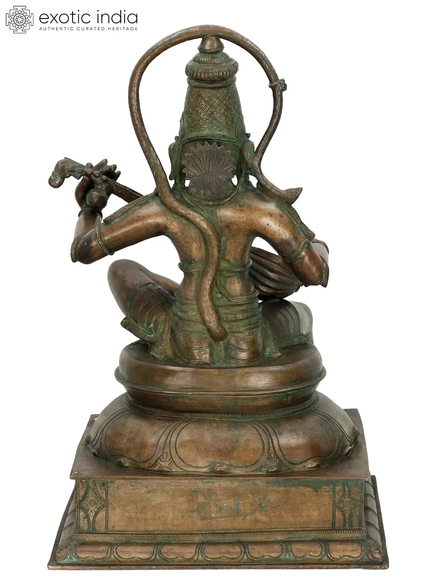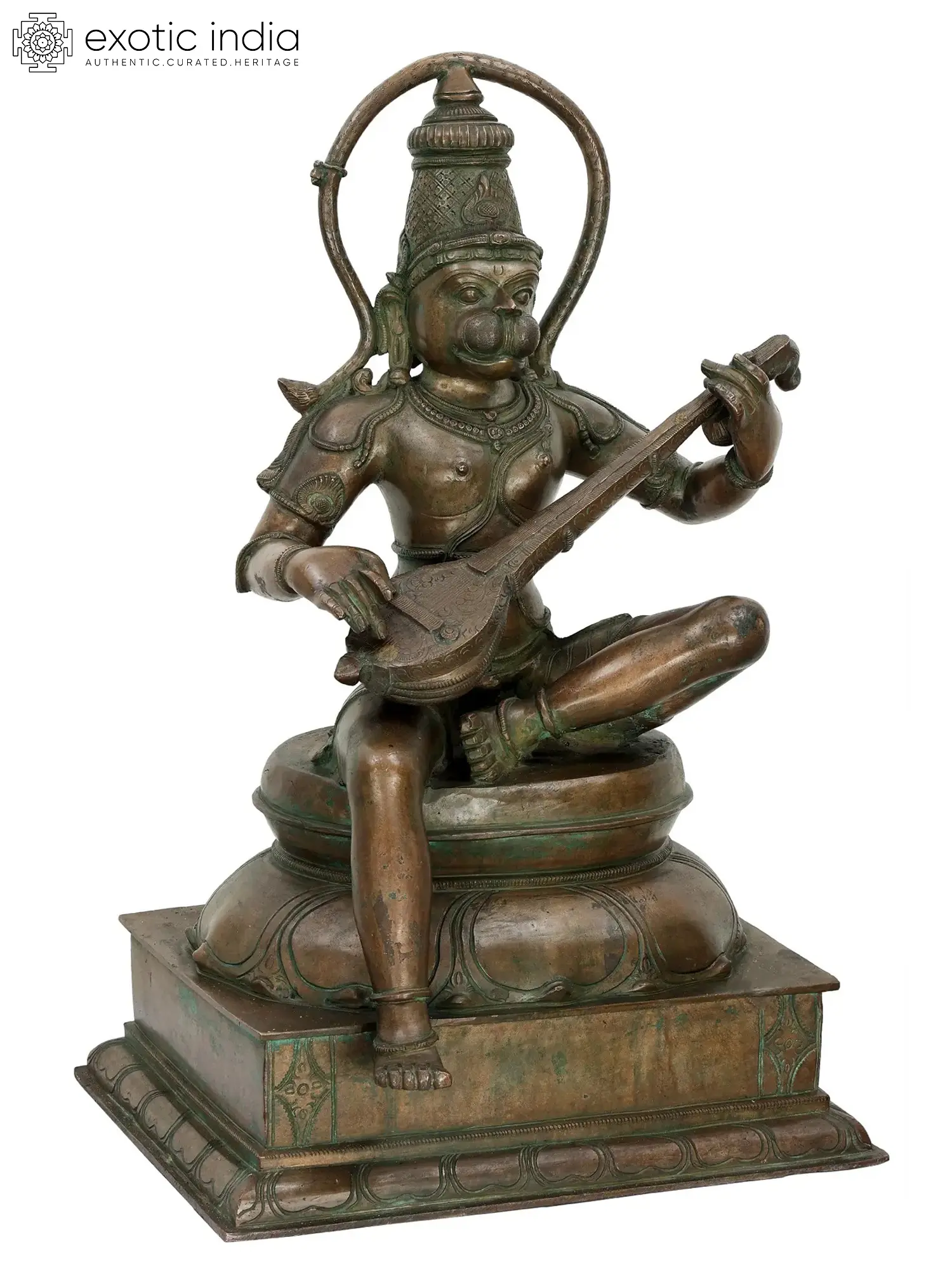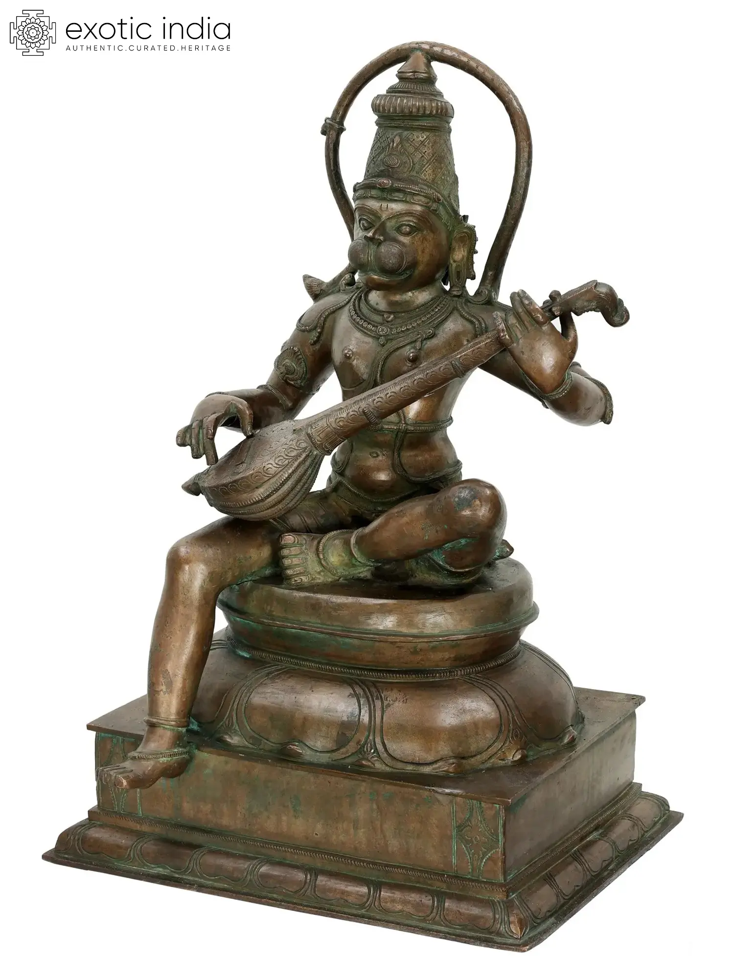 A Hanuman bronze idol such as this one would be a valuable addition to the home of any devotee. Seated in lalitasana on an upturned lotus, the Ramabhakta strums on the veena with two hands. He is singing bhajans in praise of the great Lord Rama, without His love and service to whom the Ramayana would have remained incomplete.