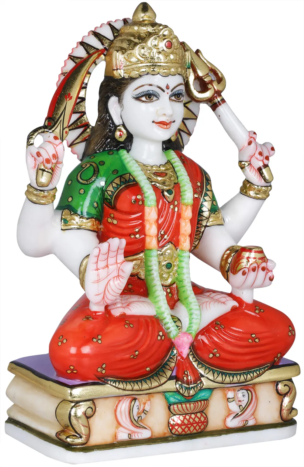 Clad in a vibrant orange saree that falls loose on her torso and a contrasting green blouse, both decorated with golden motifs and border, she holds a gesture of blessing her devotees and carries a golden rice bowl, superbly carved sword and a trident in each of her other three hands; ornamented in gracious necklace set and other jewels, a thick kamarband that holds the loose pleats of her saree, tri-colored long flower garland and a sun haloed crown that glorifies her head.