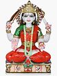 Santoshi Mata is venerated as the mother of satisfaction and joy; she is opined as the benevolent form of Goddess Durga and worshipped popularly in North India in the form of vrats, which prompt harmony and a boon of contentment. She sits here in a lotus posture on a thick pedestal, carved exquisitely, depicting two women paying obeisance to the goddess and a water kalash kept in between as a worship ritual.