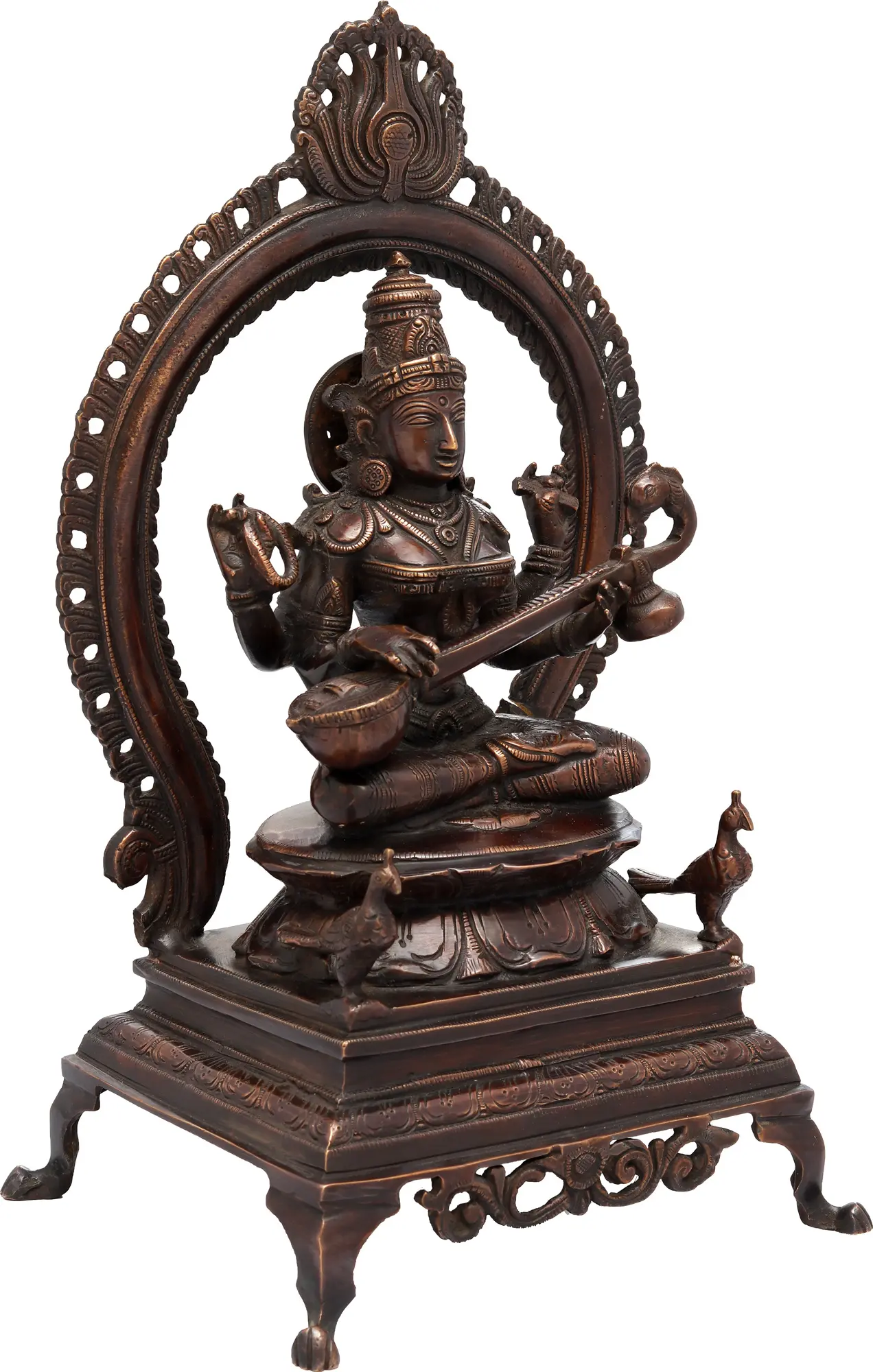 Crafted from high-quality brass, this statue boasts a timeless appeal and enduring strength. The rich, antiqued finish lends it a sense of historical depth and spiritual gravitas. The meticulous detailing, from the delicate adornments on her crown and jewelry to the intricate folds of her attire, speaks volumes about the skill and devotion of the artisans who brought this divine form to life. The ornate aureole that frames the goddess further enhances her divine radiance and presence. This statue is more than just an object of worship; it is a testament to the enduring power of art and a conduit to the boundless wisdom and creative spirit of Goddess Saraswati. Place this magnificent piece in your home, study, or place of worship to invite inspiration, foster learning, and celebrate the arts.