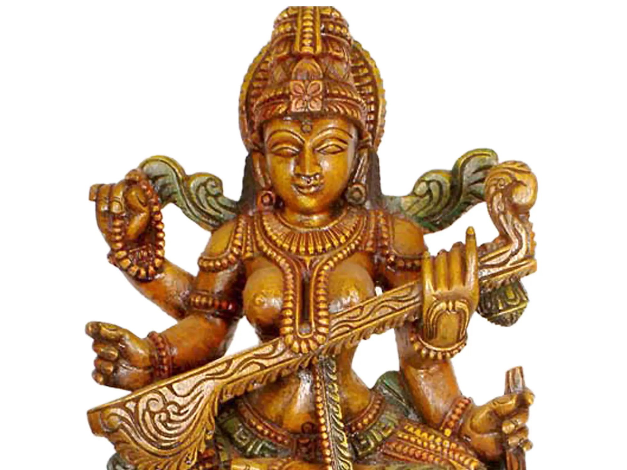 This depiction of the Goddess presents her with four arms, each holding symbolic objects. In her hands, she is shown with a mala or rosary symbolizing meditation, prayer and the power of spirituality. In another hand, she has scriptures representing sacred knowledge and the importance of learning. One of her most recognized attributes is the Veena that is an ancient string instrument symbolizing her mastery of music and arts. A common sight is her hand in the Varada mudra, bestowing blessings to her devotees. The lotus upon which she sits underscores her purity, while the swan and peacock nearby are associated with wisdom, learning and aesthetics.