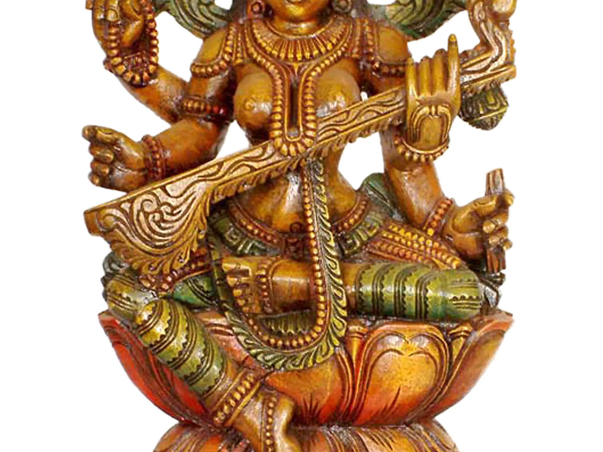 Represented in this elegant form is the Hindu Goddess of knowledge, music, arts, wisdom and learning. She is a central figure in the Hindu pantheon, revered as the embodiment of all creative endeavors and intellectual pursuits. As the consort of Brahma, the creator of the universe, she represents the active energy and power of creation. It is believed that without her, Brahma's creative potential would remain dormant. She is often depicted seated on a lotus flower, a symbol of purity and enlightenment, reflecting her association with knowledge and spiritual awakening. She is the divine force that brings order and harmony to the universe, inspiring creativity and fostering intellectual growth.