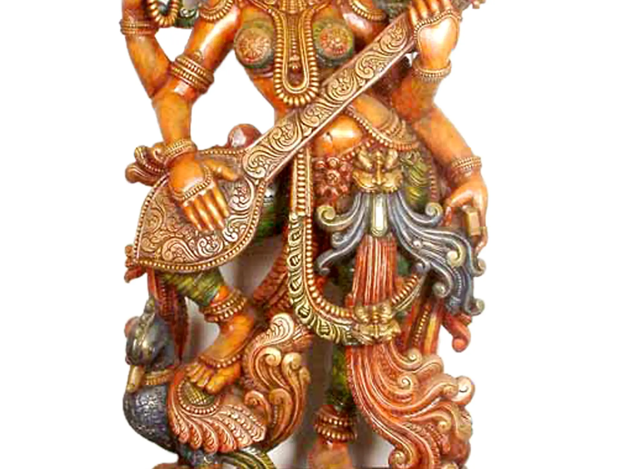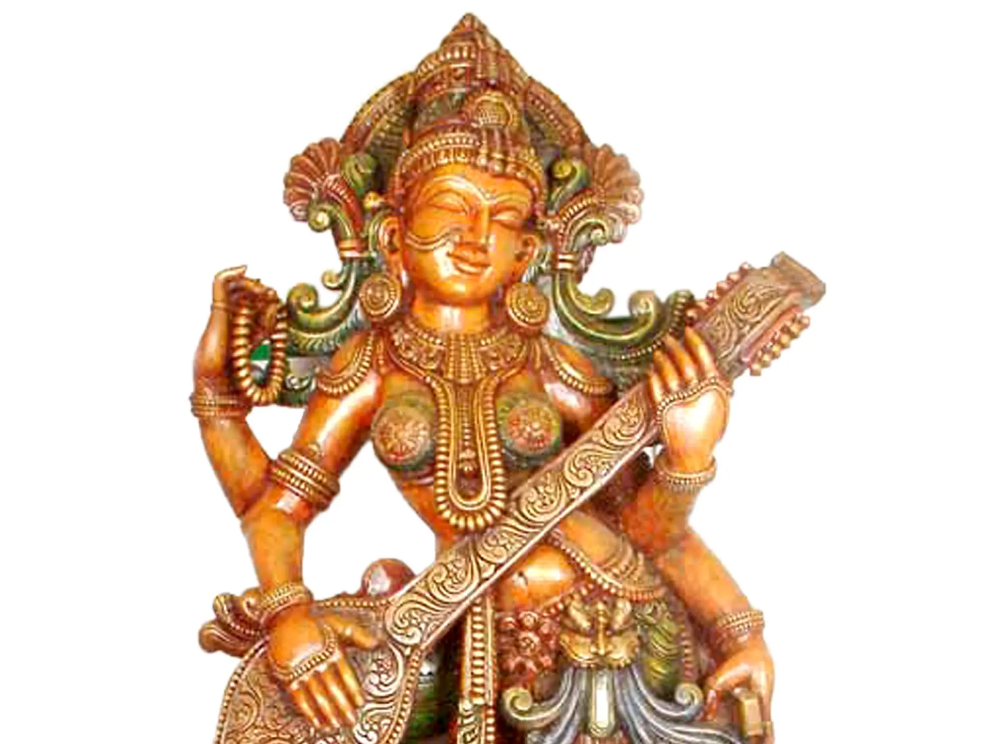 This splendid wooden carving portrays a revered deity. In Hindu mythology, she is the goddess of knowledge, music, arts, wisdom, and learning. She embodies the free flow of wisdom and consciousness. Often depicted seated on a lotus flower, symbolizing purity and divine knowledge, she is the embodiment of inspiration and creativity. Her presence is invoked for success in academic pursuits, artistic endeavors, and the pursuit of enlightenment. She is believed to bestow clarity of thought, eloquence of speech, and mastery of the arts upon her devotees.