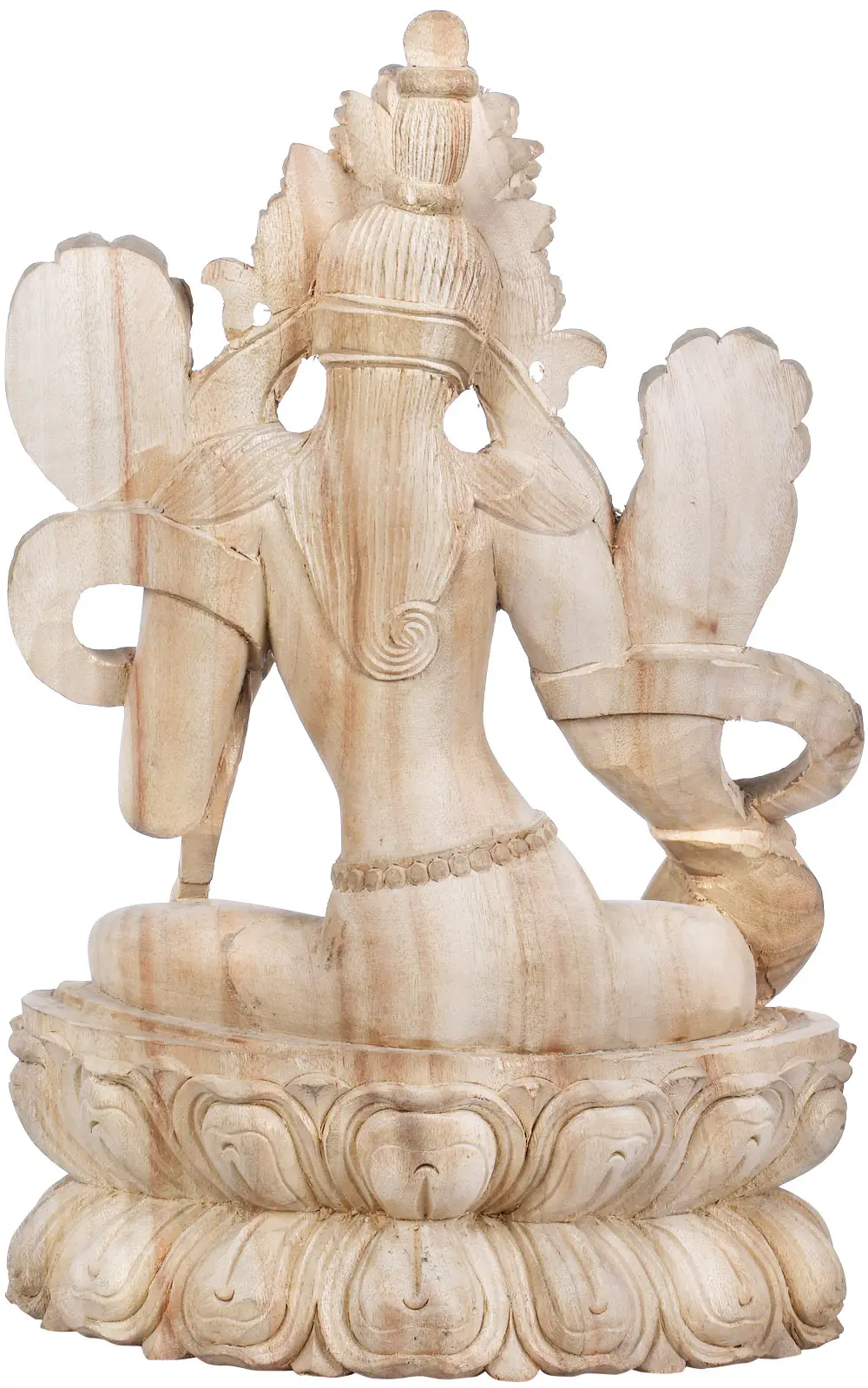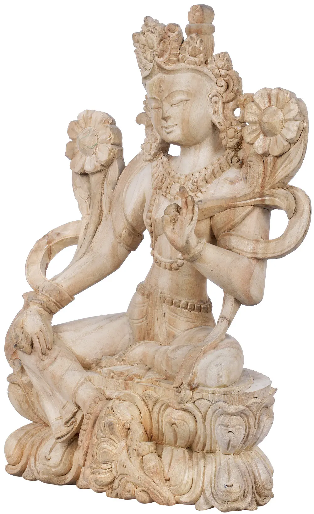 The artistry of this statue is a testament to the rich wood-carving traditions of Nepal. The smooth, natural wood grain enhances the delicate features of the goddess, from the intricately adorned crown and flowing robes to the subtle musculature and graceful hand gestures. In her left hand, she holds the stem of a lotus flower, a potent symbol of purity, enlightenment, and spiritual growth, which blooms beside her. Her right hand is in the Varada mudra, the gesture of giving, signifying her readiness to bestow blessings and fulfill aspirations. She is depicted seated in the posture of ease, her right leg extended, suggesting her active engagement in the world and her willingness to descend and aid those in need. The intricate floral motifs and beadwork that adorn her, from her necklaces to her belts, add to the divine beauty and spiritual significance of the piece. Each element is carved with precision, reflecting a deep understanding of Buddhist iconography and a profound reverence for the deity. This sculpture is not merely an object of art, but a conduit for devotion and a reminder of the ever-present compassionate energy of Green Tara.