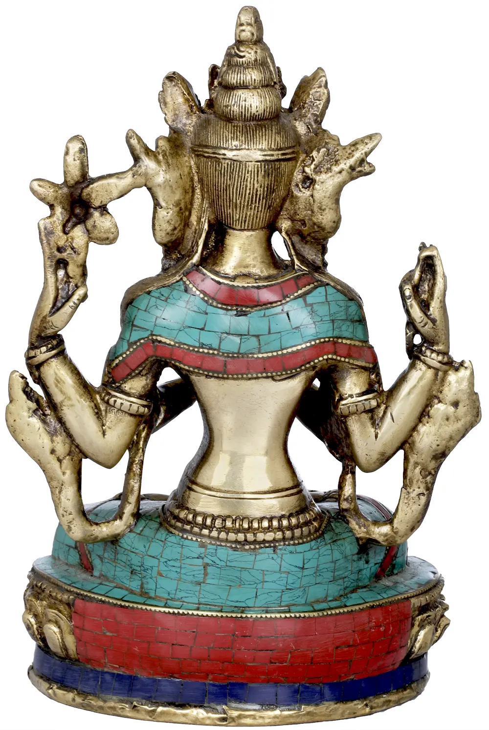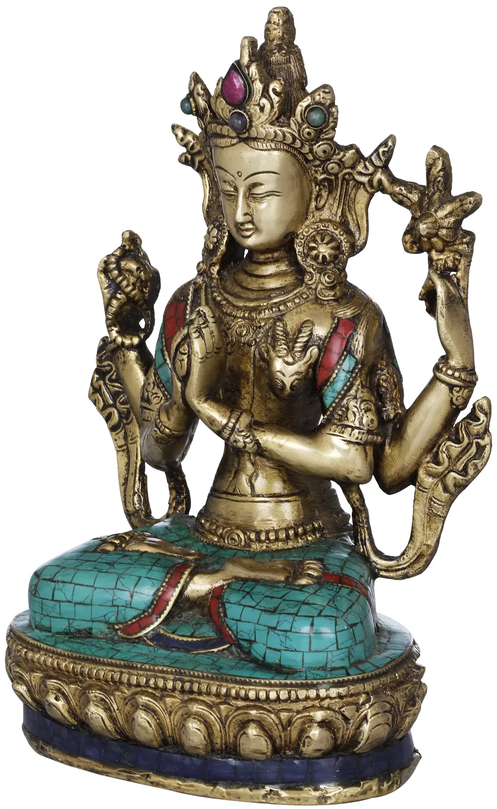 In Tibetan, the name Chenrezig translates to ‘he who watches over consistently with eyes of compassion’. Indeed, Bodhisattva Chenrezig never ceases to watch guard over His devotees, never fails them, and never tries them. Upon a flattened lotus pedestal He is poised, His dhoti and angavastram lain over with turquoise and crimson bits. Matching inlay is to be found on His signature five-spired crown. The same seemingly blends into the superb kundalas dangling from His karna (ears).
