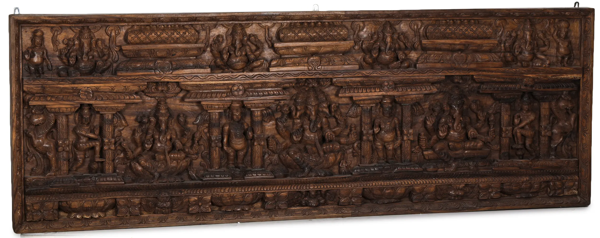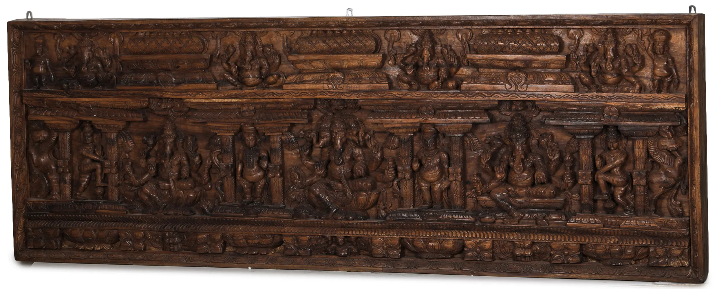 Beyond the prominent Ganeshas, the panel unfolds to reveal a dynamic tableau of other divine figures and mythical creatures, reminiscent of the intricate carvings found in ancient South Indian temples. Figures in dance postures suggest divine celebration and the rhythmic pulse of creation, evoking the cosmic dance of Shiva or the graceful movements of celestial beings. The presence of formidable, lion-like creatures, often associated with divine vehicles (vahanas) or guardians, adds an element of strength and protection to the composition. These elements work in harmony to create a sense of a vibrant, sacred realm brought to life through the sculptor's masterful hand. Each detail, from the ornate pillars to the delicate floral motifs, contributes to the overall grandeur and spiritual resonance of the piece. This carving is more than just an object; it is a gateway to a world of ancient beliefs and enduring artistic traditions.