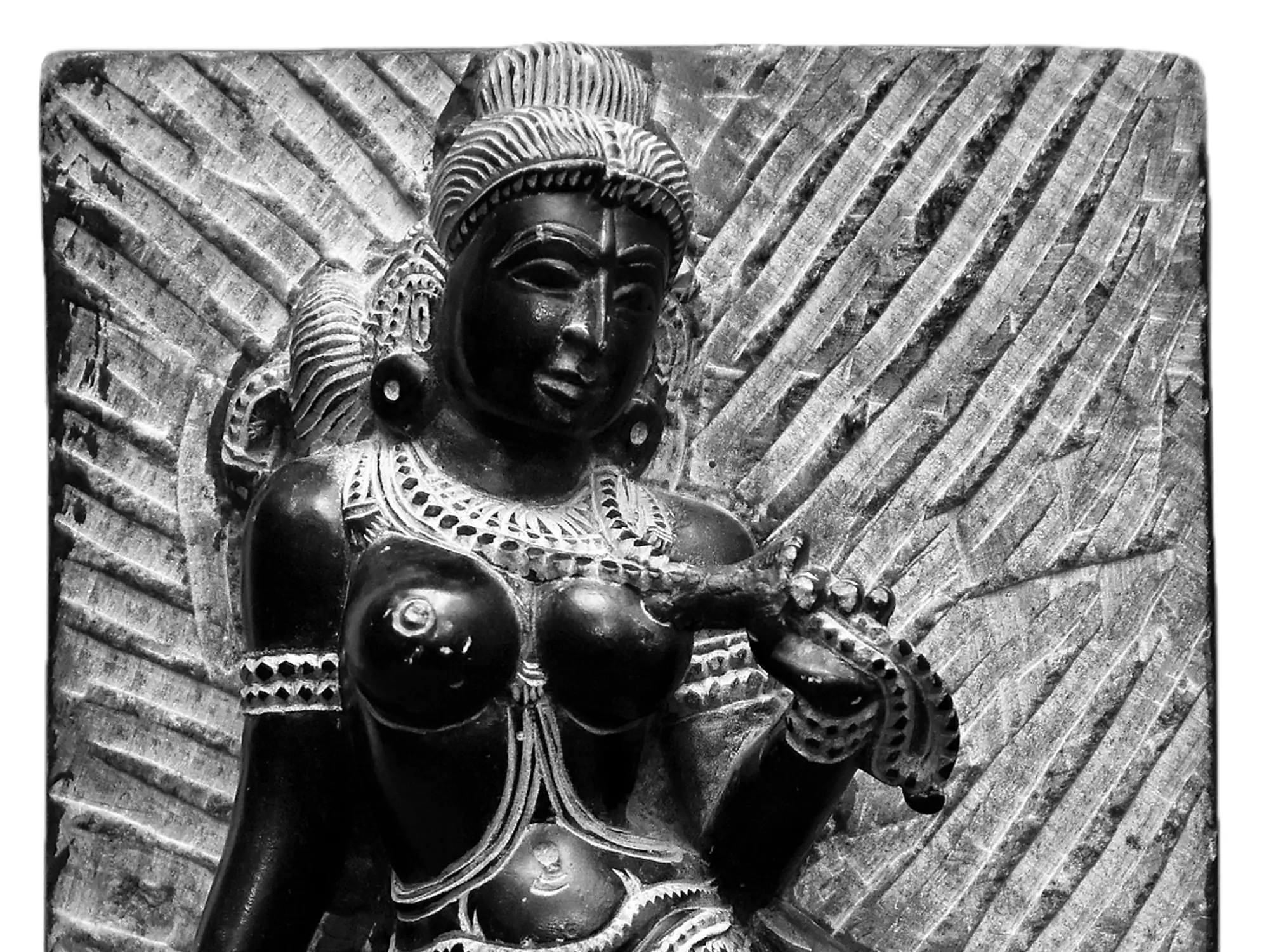 The stunning black Kadappa Stone wall panel featuring Shakuntala with a deer is a captivating work of art. The statue portrays Shakuntala with voluminous breasts and standing in a graceful Tribhanga pose, exuding femininity and beauty. Her gestured hold on the garland showcases a stylized touch, enhancing the elegance of the sculpture.