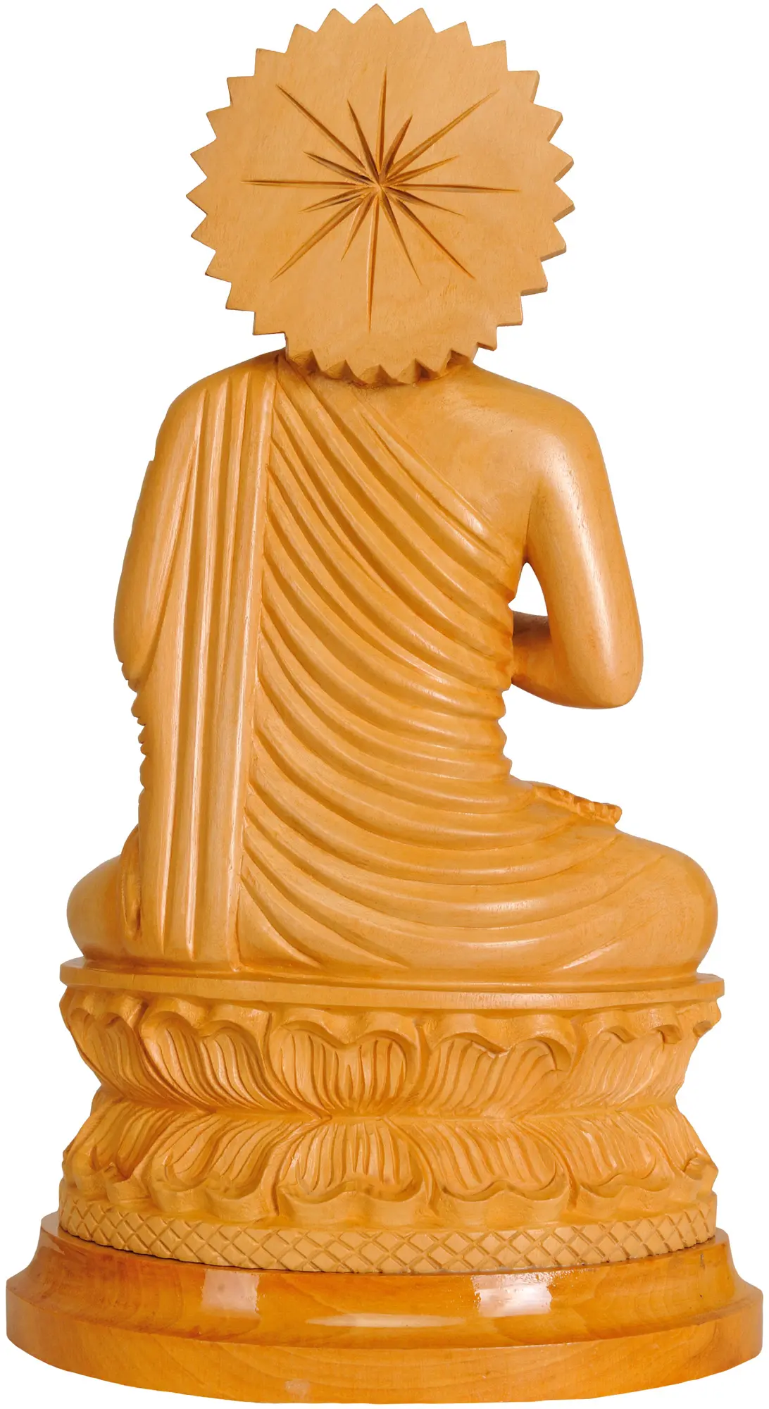 The gentle smile playing on his lips and the closed eyes suggest an inner stillness, a deep connection to the universal truths he discovered. The intricate folds of his monastic robes are rendered with remarkable detail, flowing gracefully around his form, hinting at the simplicity and detachment he advocated. Surrounding his head is a radiant halo, reminiscent of the sunburst motif often seen in Buddhist art, symbolizing the Buddha's enlightenment and the illumination of the world with his wisdom.