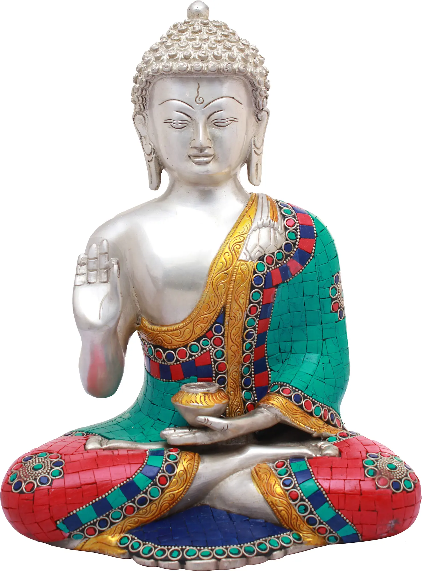 The traditional robes of the Buddha are brought to life with a vibrant mosaic of inlaid stones, showcasing a rich tapestry of turquoise, lapis lazuli, and carnelian hues. This intricate detailing, framed by ornate golden trim, not only enhances the visual appeal but also symbolizes the manifold facets of Buddhist teachings. The precision of the inlaid stones, arranged in geometric patterns and floral motifs, speaks to the dedication and artistry of the craftspeople. The gentle curve of the Buddha's fingers in the preaching gesture, coupled with the calm serenity of his countenance, invites contemplation and inner peace. His eyes, subtly closed in meditation, suggest a deep inward focus and profound understanding of the human condition. ––––––––––––––––––