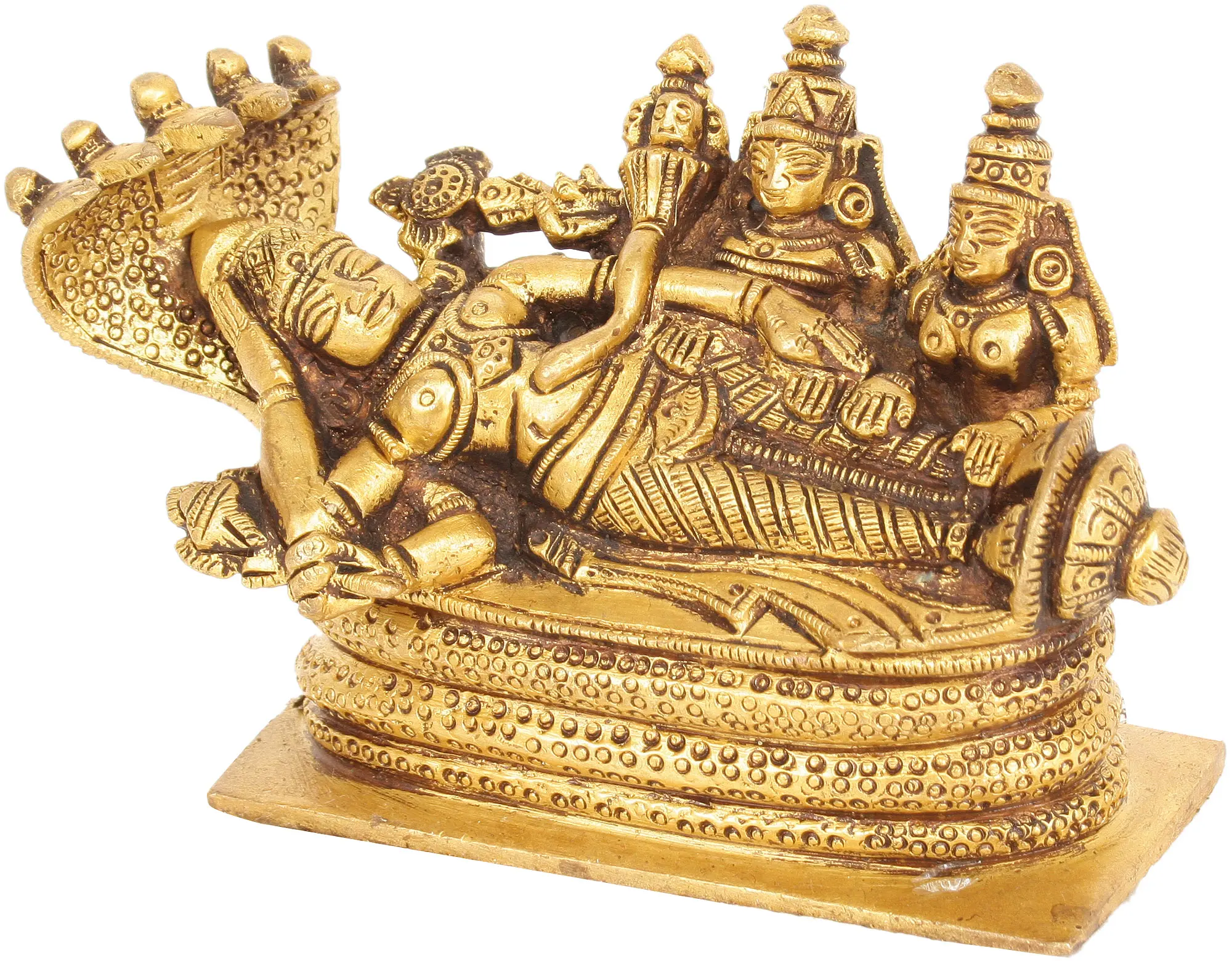 This Shesh Shayi Vishnu statue is a testament to the skilled craftsmanship of India. Fashioned from brass, a metal revered for its durability and lustrous sheen, the sculpture is meticulously handcrafted, ensuring that each detail, from the scales of Sheshnag to the serene expressions of the deities, is rendered with precision. The warm, golden hue of the brass enhances the divine aura of the piece, making it a captivating focal point for any sacred space or home decor. The compact size makes it an ideal adornment for altars, shelves, or study desks, allowing you to invite the blessings of Lord Vishnu into your daily life. This piece is not merely an object of art but a conduit to spiritual contemplation, a tangible connection to the timeless tales of Hindu cosmology.