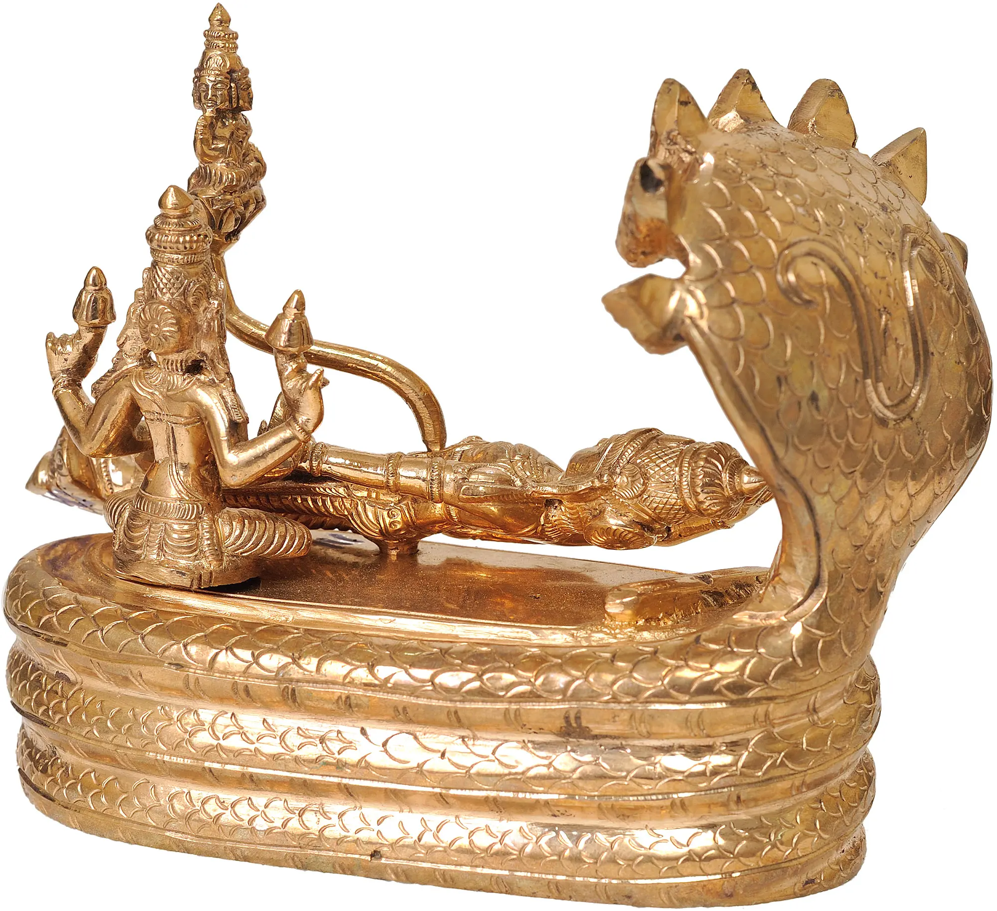 This exquisite bronze statue captures the divine repose of Lord Vishnu in his cosmic slumber, a profound depiction of the deity resting on the coils of the great serpent, Shesha. In Hindu cosmology, Shesha Naga, also known as Ananta, is the king of all nagas and serves as the couch for Lord Vishnu. This eternal rest is not one of inactivity, but a state of deep meditation and cosmic consciousness, from which the universe emerges and into which it eventually dissolves. It is during this period of rest, known as *Yoga Nidra*, that Lord Vishnu contemplates the cycles of creation, preservation, and dissolution, overseeing the continuity of existence. The coiled serpent, intricately detailed with its multiple heads raised protectively, forms a majestic canopy over the reclining deity. Each of the serpent's heads is carved with serene yet vigilant expressions, symbolizing its role as a divine protector and the embodiment of primordial energy. The scales of Shesha are rendered with a remarkable texture, giving the impression of a living, breathing entity supporting the Lord of the Universe. This imagery signifies that even in rest, the divine is ever-present, maintaining order and balance.