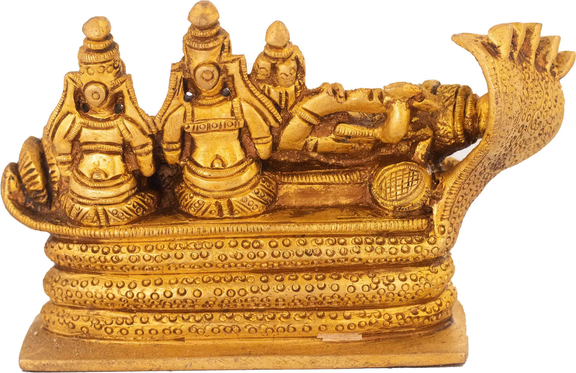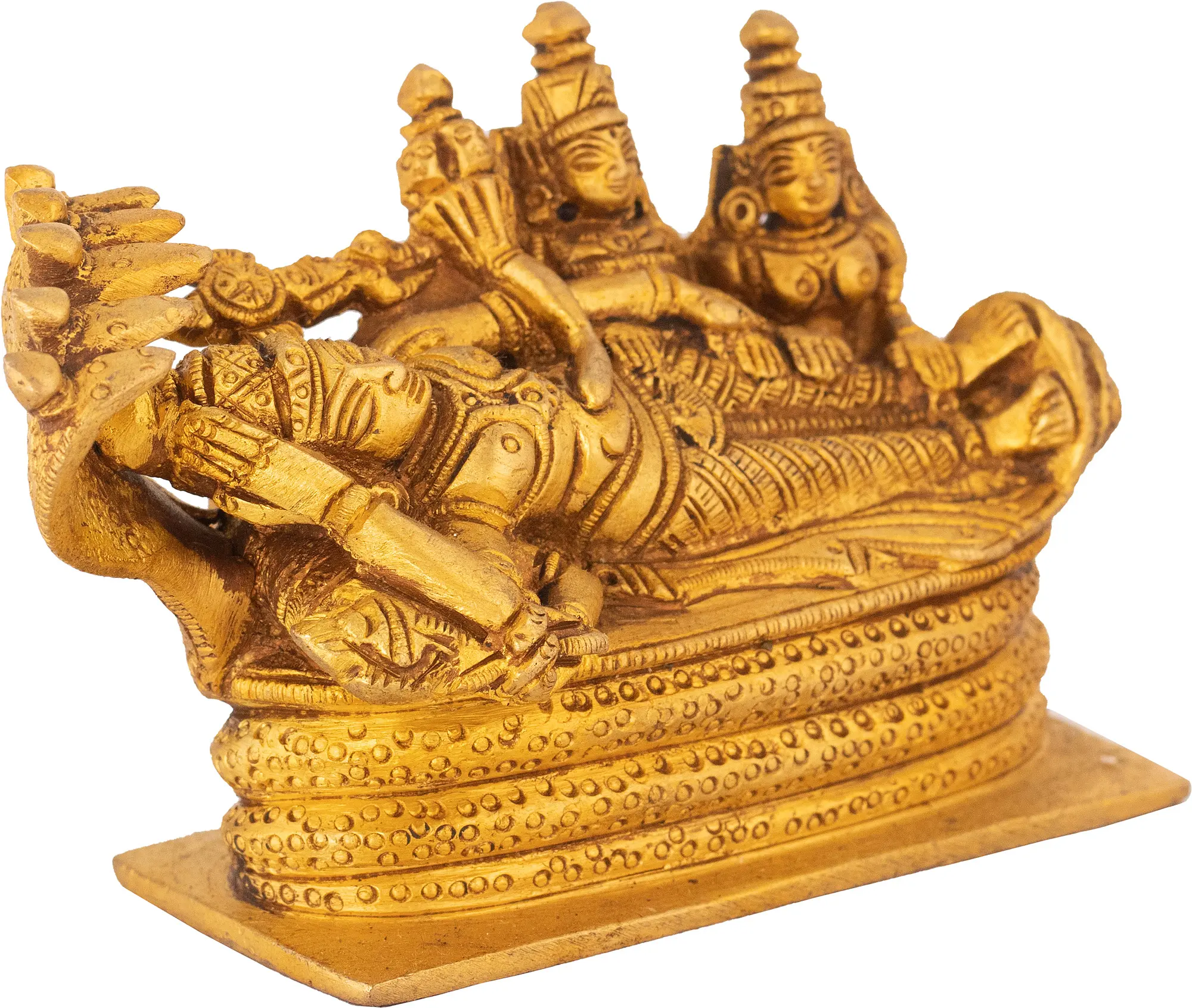 This exquisite brass statue captures the divine essence of Lord Vishnu in his cosmic repose, known as Sheshashayi Vishnu. Here, the Supreme Being rests serenely upon the coils of the great serpent Shesha, also called Ananta, the cosmic bed that cradles the universe. This profound imagery signifies Vishnu's eternal existence and his role as the preserver of creation, floating on the primordial waters of the vast ocean before the dawn of existence, or between cycles of cosmic dissolution and regeneration. The detailed craftsmanship of this statue brings to life the intricate iconography associated with this divine form. Lord Vishnu is depicted with a calm and meditative countenance, his body gracefully reclining. The formidable Shesha Naga, with its multiple hoods raised, forms a protective canopy over the Lord, symbolizing divine protection and auspiciousness. The textured scales of the serpent are rendered with meticulous care, adding to the statue's realism and devotional appeal. The presence of Lakshmi, the Goddess of Wealth and Prosperity, seated beside Lord Vishnu, further enhances the scene, representing harmony and auspiciousness in the divine union. This iconography draws from the Puranic lore where Lakshmi's gentle touch is said to awaken Vishnu from his deep slumber, bringing forth new creation.