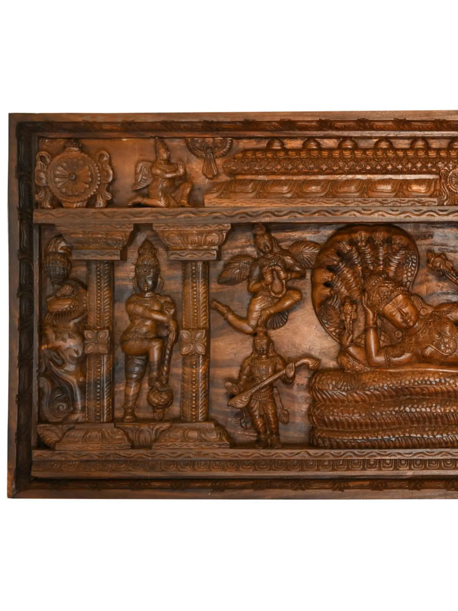 This panel is a remarkable example of the traditional wood carving techniques that have been passed down through generations in South India. The artists meticulously transform blocks of temple wood into a vibrant tableau, imbuing each figure with life and character. The rich, warm tones of the wood enhance the spiritual aura of the carving, making it a truly captivating piece. The architectural elements framing the central scene, such as the intricately carved pillars and decorative borders, further enhance the grandeur and sacredness of the depiction, reminiscent of the architectural styles found in ancient South Indian temples. The very act of carving this piece would have been considered a devotional practice, an offering to the divine. The depiction of Sheshshayi Narayana is deeply rooted in the Puranic literature, particularly the Srimad Bhagavatam. It represents a state of transcendental bliss and the ultimate resolution of all conflicts. This carving serves not only as a beautiful work of art but also as a focal point for meditation and contemplation, allowing viewers to connect with the profound philosophical and spiritual concepts it embodies. Owning such a piece is to invite a sense of divine peace and cosmic harmony into your space, a tangible connection to the eternal cycle of existence as envisioned in the rich tapestry of Indian spirituality. The skilled hands that shaped this wood have woven a story of cosmic order, divine peace, and enduring creation.