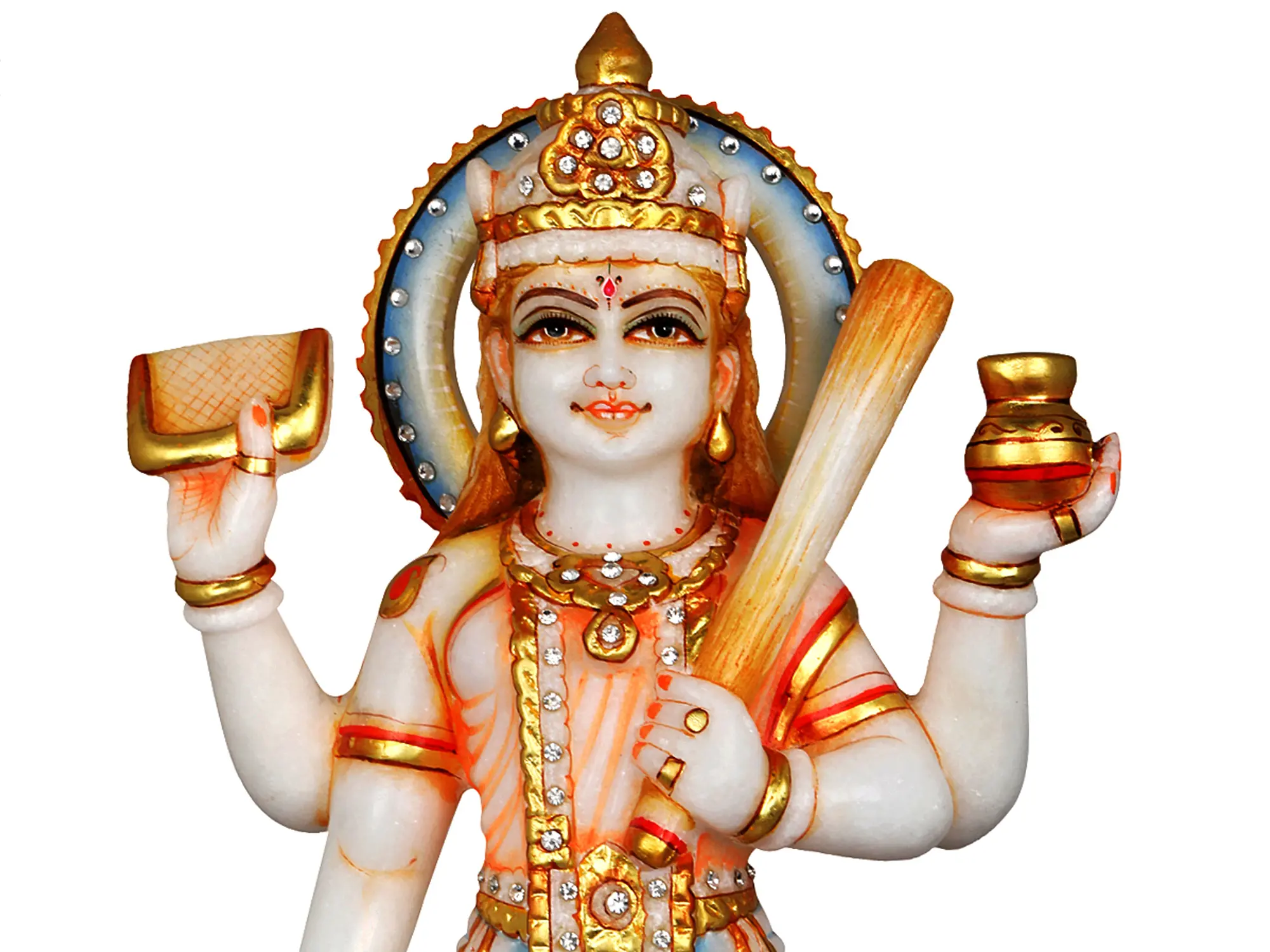 Here she is shown with four hands, left hand holds a broom to dust off the germs and right hand has a kamandalu (sacred pot of cold water) to purify and cure people of diseases. Other two hands have a pot full of viruses and a winnow to sieve the purities from impurities. Her gracefully draped saree and the heavenly halo enhance her wondrous divinity. Marvelous crown and jewels adorned on her body are remarkably astounding.